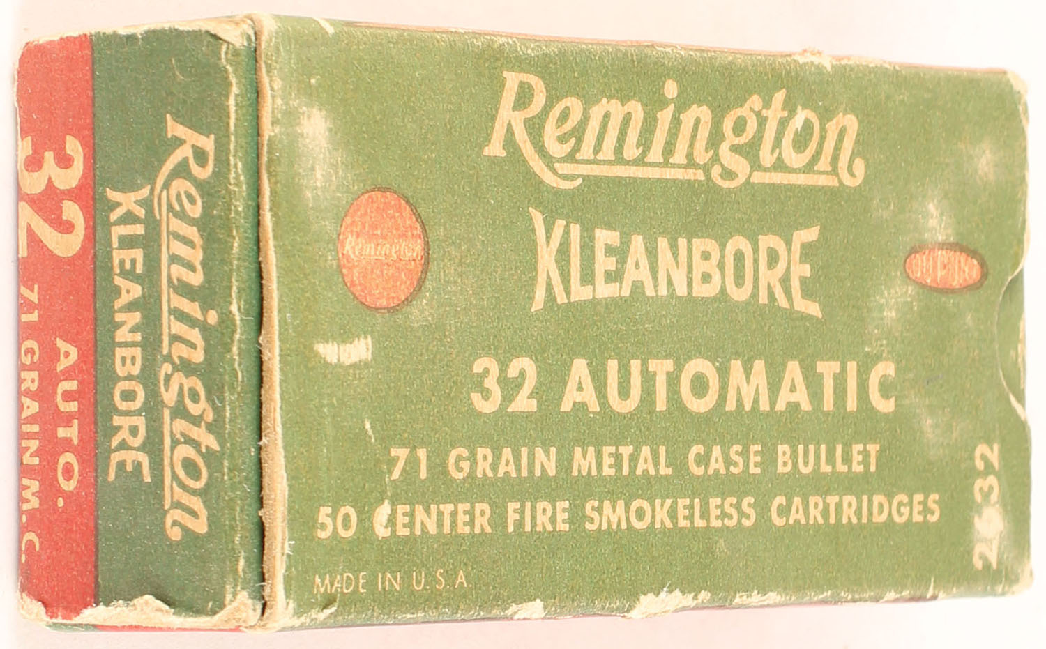 Remington, Kleanbore, .32 Automatic, 71 Grain Metal Case Bullet, Full, 1pc. Green buff & red box, box is solid with good color, color fading, minor shelf wear, some edge & corner wear, end flaps are solid, ammo is excellent. Grade: Very Good - Value: 24 to 36