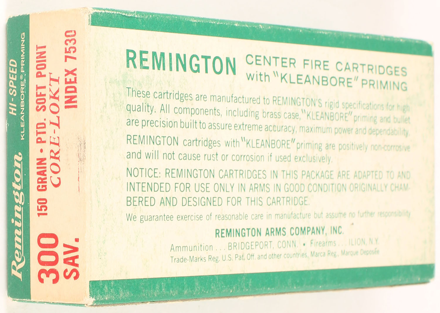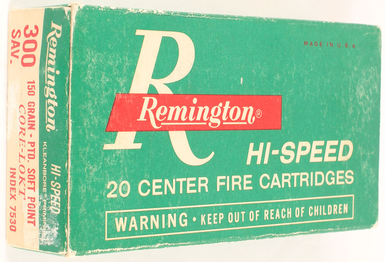 Remington, Hi-Speed, .300 Savage, 150 Grain PTD. Soft Point Core-Lokt, Full, 1pc, Green white & red box, box has minor scuffing with excellent colors, ammo is very good. Grade: Excellent - Value: 24 to 36