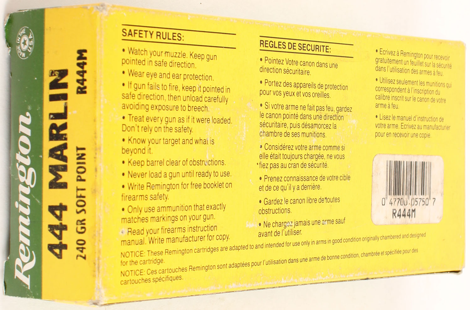 Remington High Velocity, 444 Marlin, 240 Grain Soft Point, Full, 1pc, Green & yellow box, box has some scuffing & minor edge wear, ammo is excellent. Grade: Very Good + - Value: 30 to 45