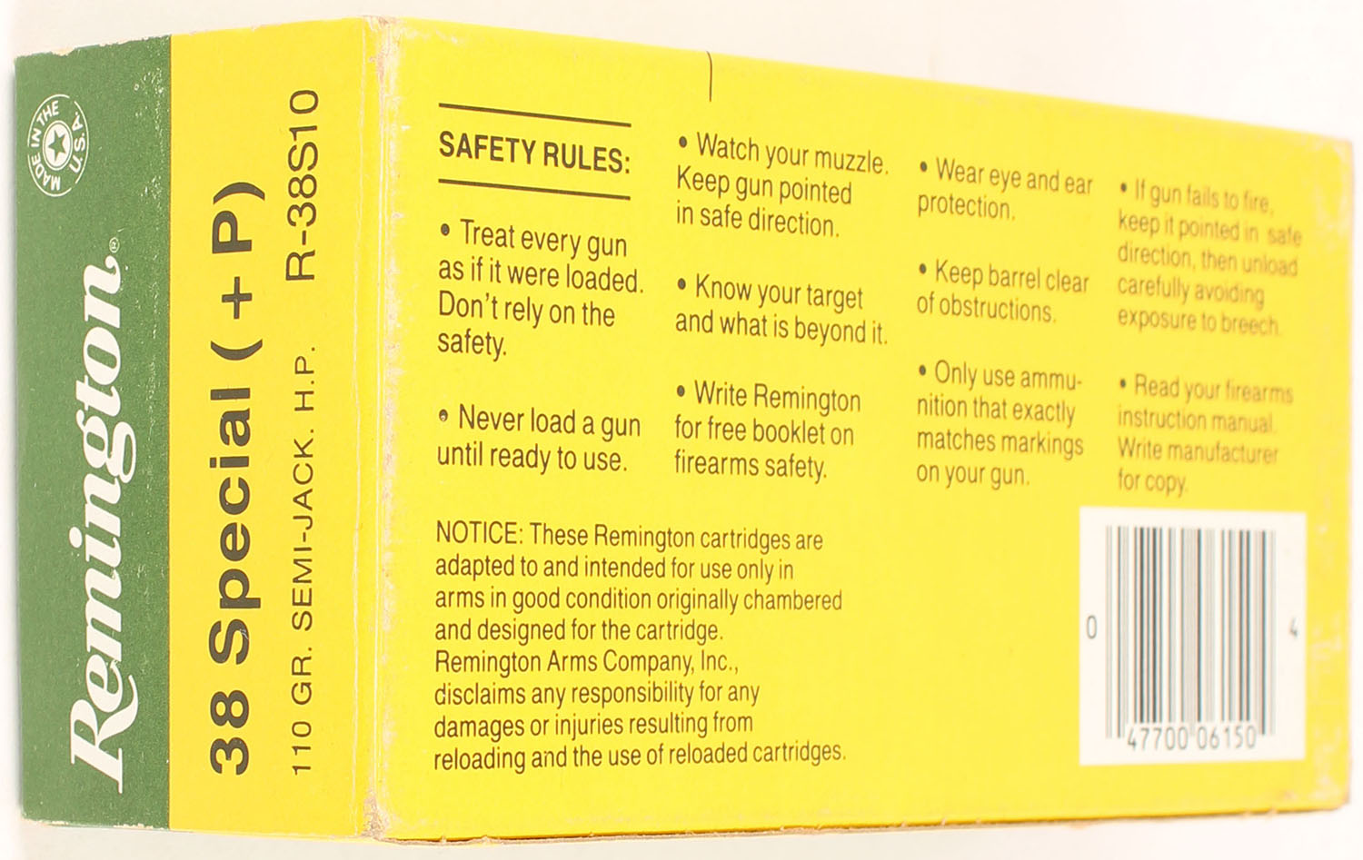 Remington, Center Fire Cartridges, .38 Special, (+P), 110 Grain Semi-Jacketed Hollow Point, Full, 1pc. Green & yellow box, box is solid with excellent color, very minor edge & corner wear, end flaps are solid, ammo is excellent. Grade: Excellent - Value: 16 to 24