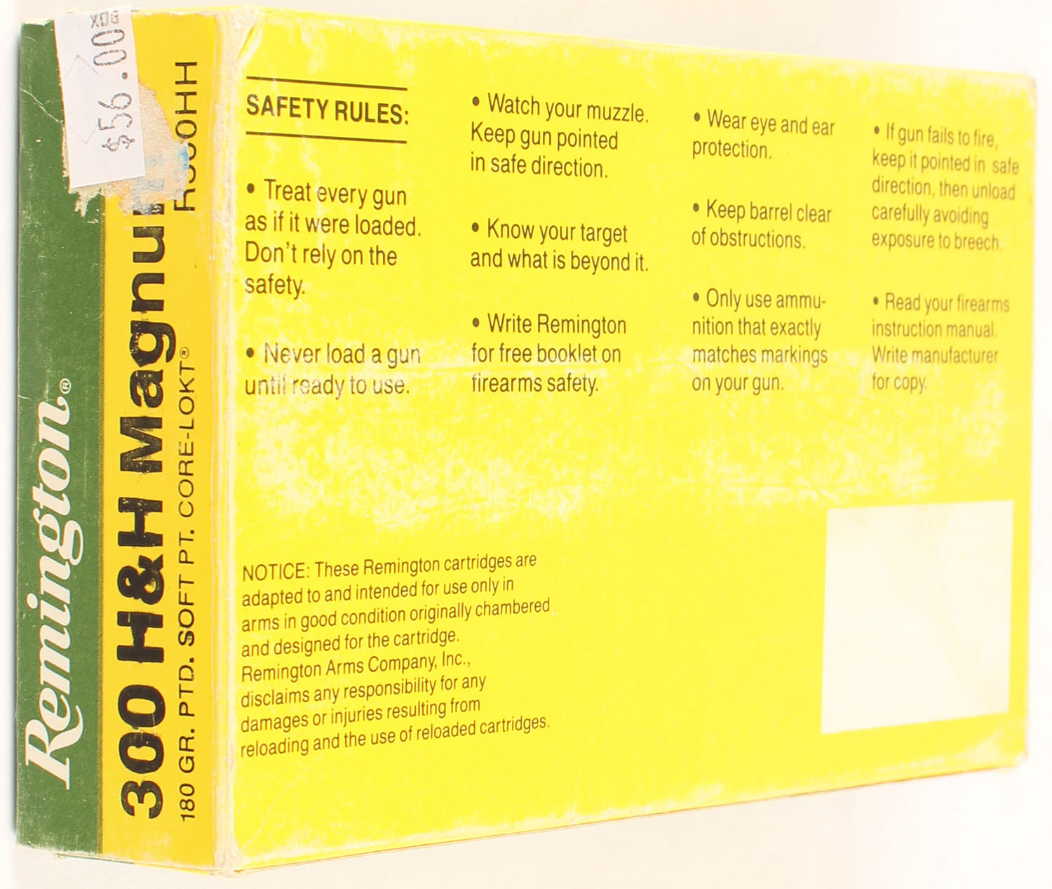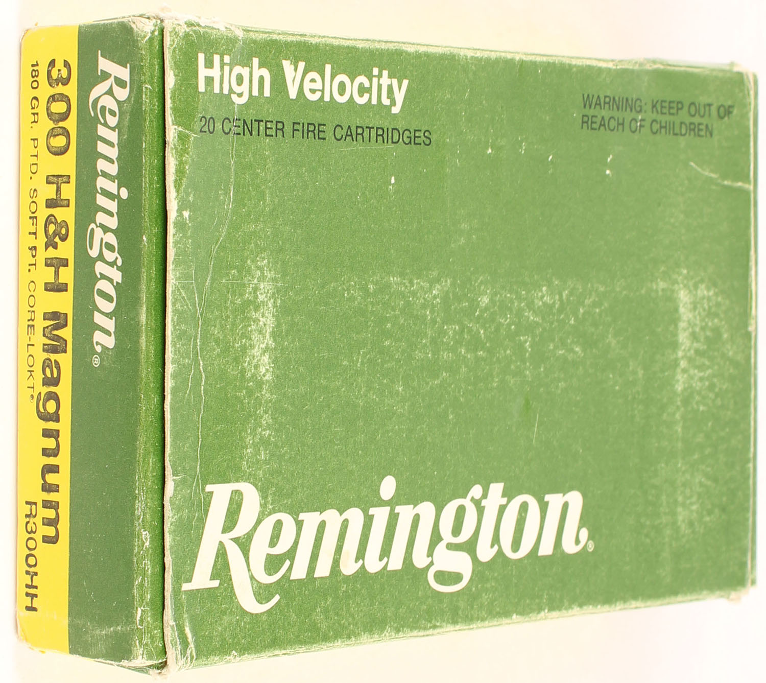 Remington, High Velocity, 300 H&H Magnum, 180 Gr. Core-Lokt Pointed Soft Point, 1pc, Full, Green & yellow box with white & black print, box has shelf wear with some edge wear, ammo is excellent. Grade: Very Good ++ - Value: 40 to 60