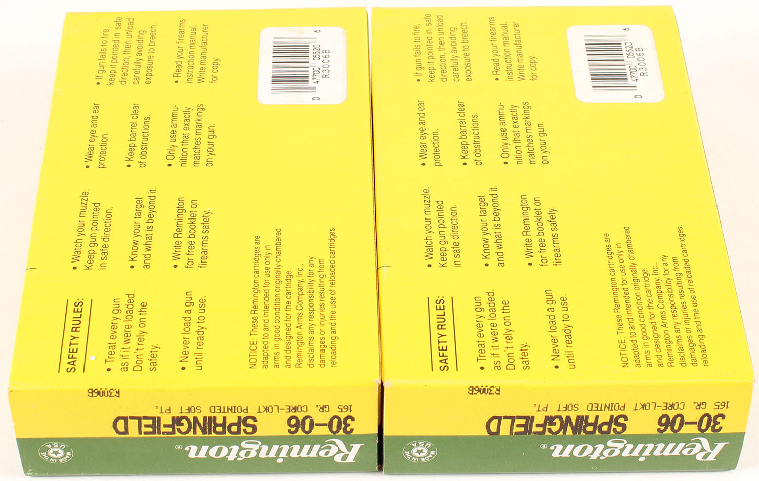 Remington, Lot of (2), High Velocity, .30-06 Springfield, 165 Grain Core-Lokt Pointed Soft Point, Full, 1pc. Green yellow & white box, box is solid with excellent color, end flaps are solid, ammo is excellent. Grade: MINT - Value: 30 to 45