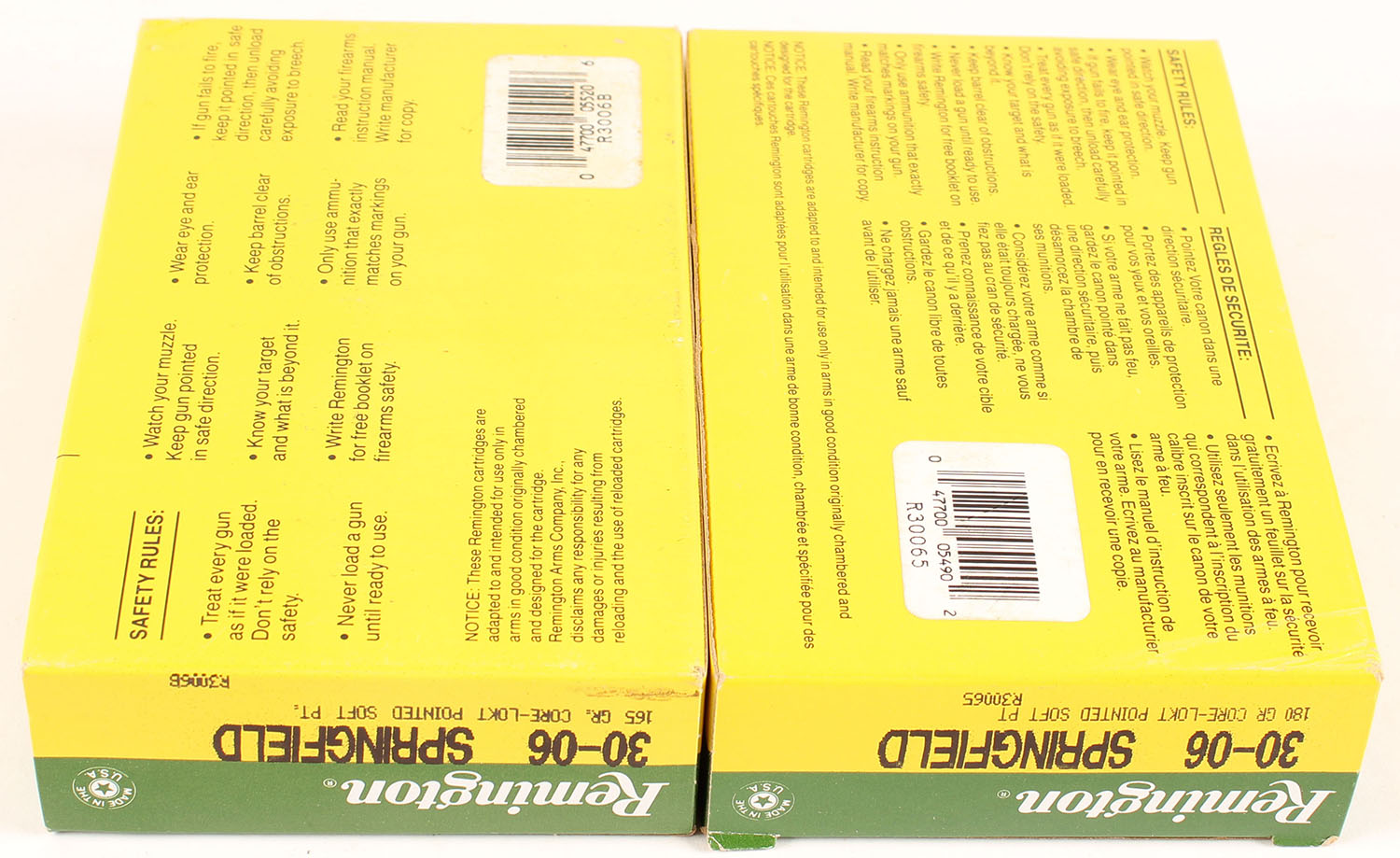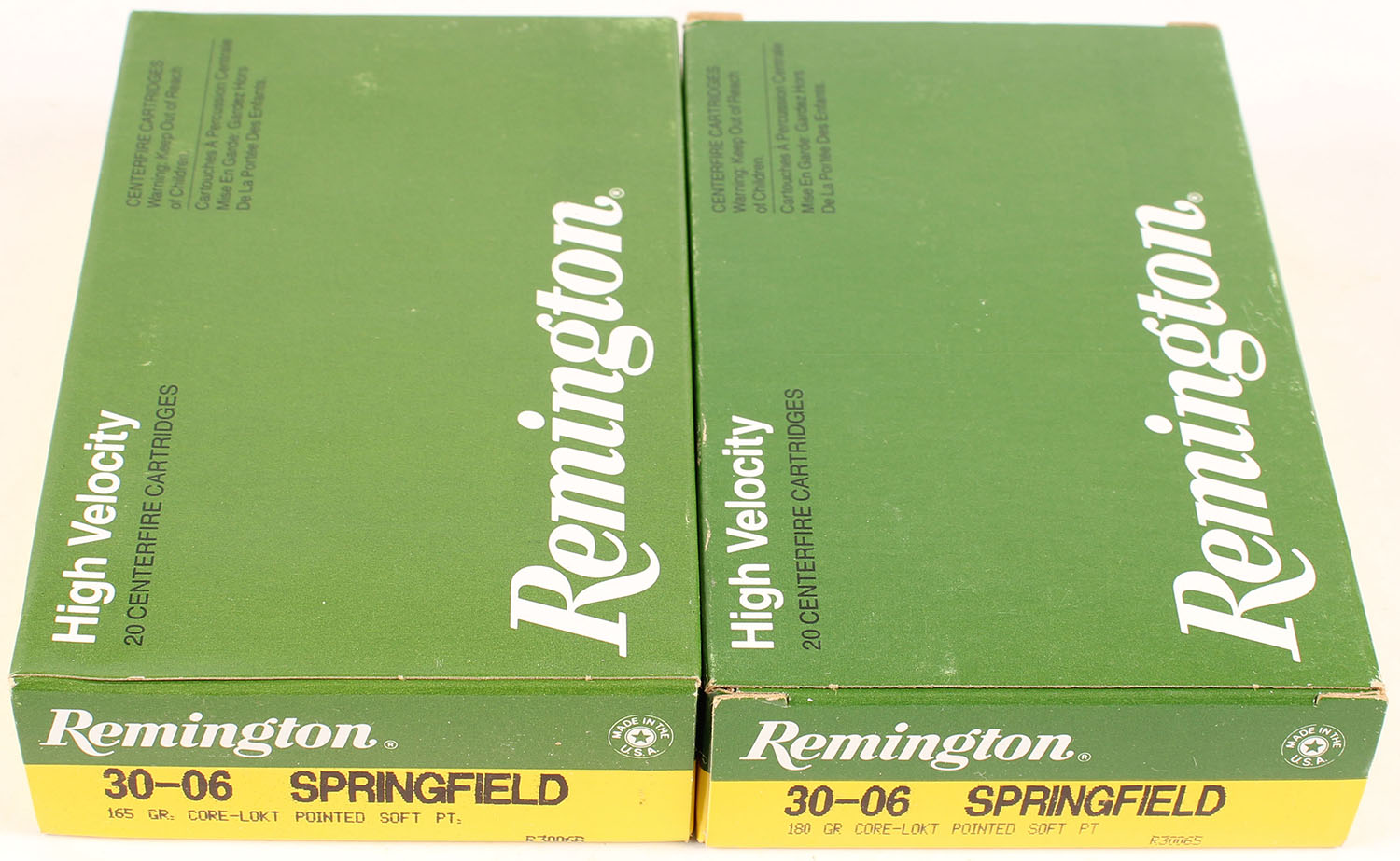 Remington, Lot of (2), High Velocity, .30-06 Springfield, 165 Grain Core-Lokt Pointed Soft Point, Full, 1pc. Green yellow & white box, box is solid with excellent color, end flaps are solid, ammo is excellent. Grade: MINT - Value: 30 to 45