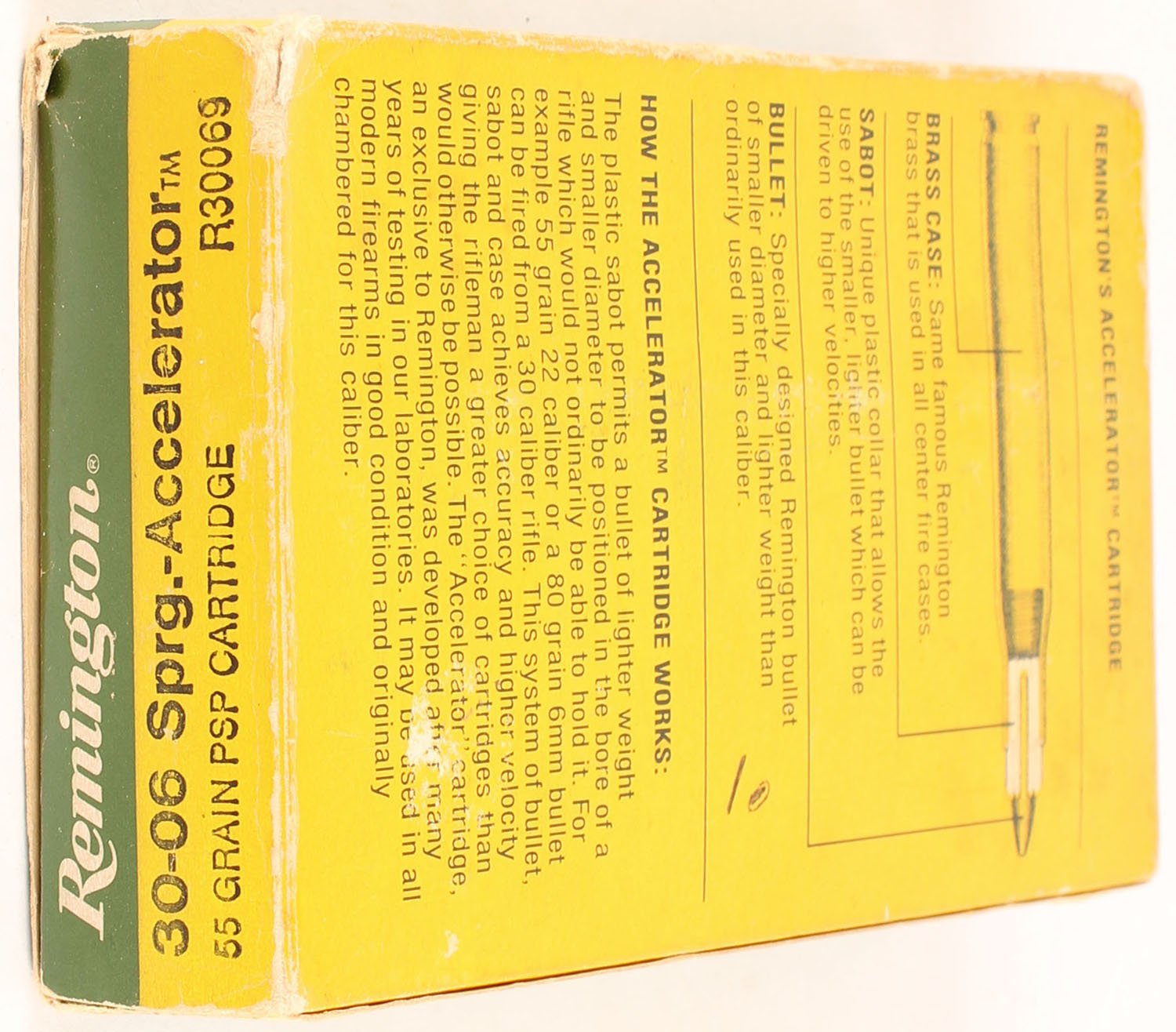 Remington, Accelerator, .30-06 Springfield, 55 Gr. Pointed Soft Point, 1pc, Full, Green & yellow box with white/black print, box has edge & corner wear with age soiling, ammo is very good. Grade: Very Good - Value: 50 to 75
