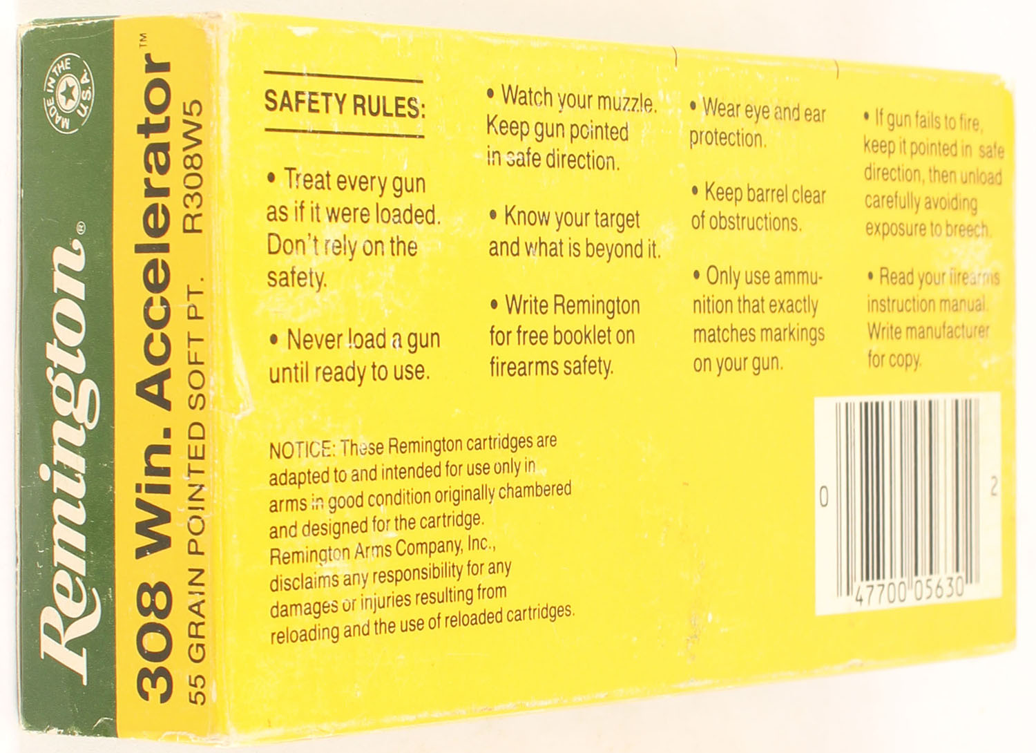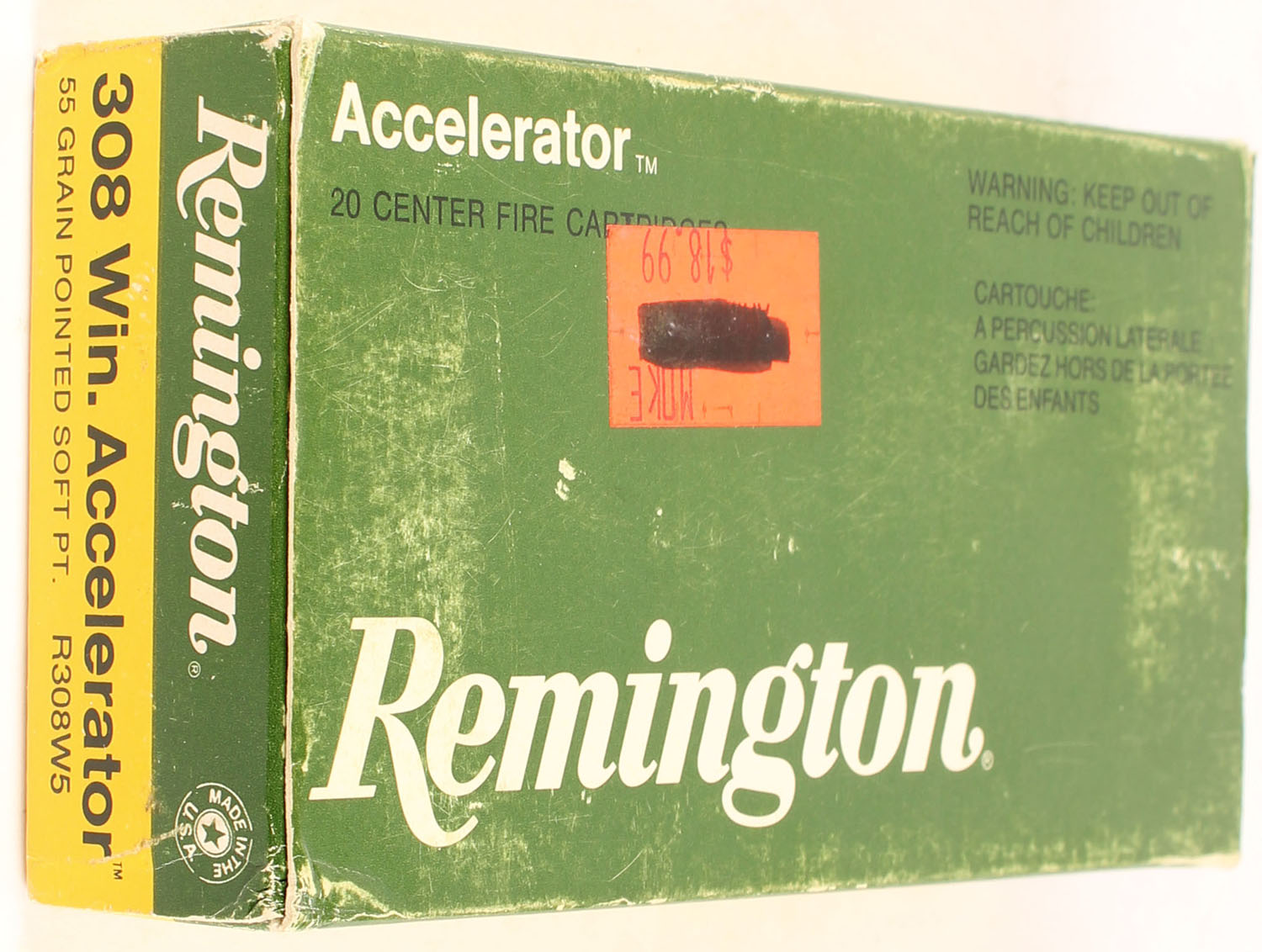 Remington, Accelerator, .308 Win. Accelerator, 55 Grain Pointed Soft Pt., Full, 1pc. Green yellow & white box, box is solid with minor scuffing, end flaps are solid, has sticker on front, ammo is excellent. Grade: Excellent - Value: 50 to 75