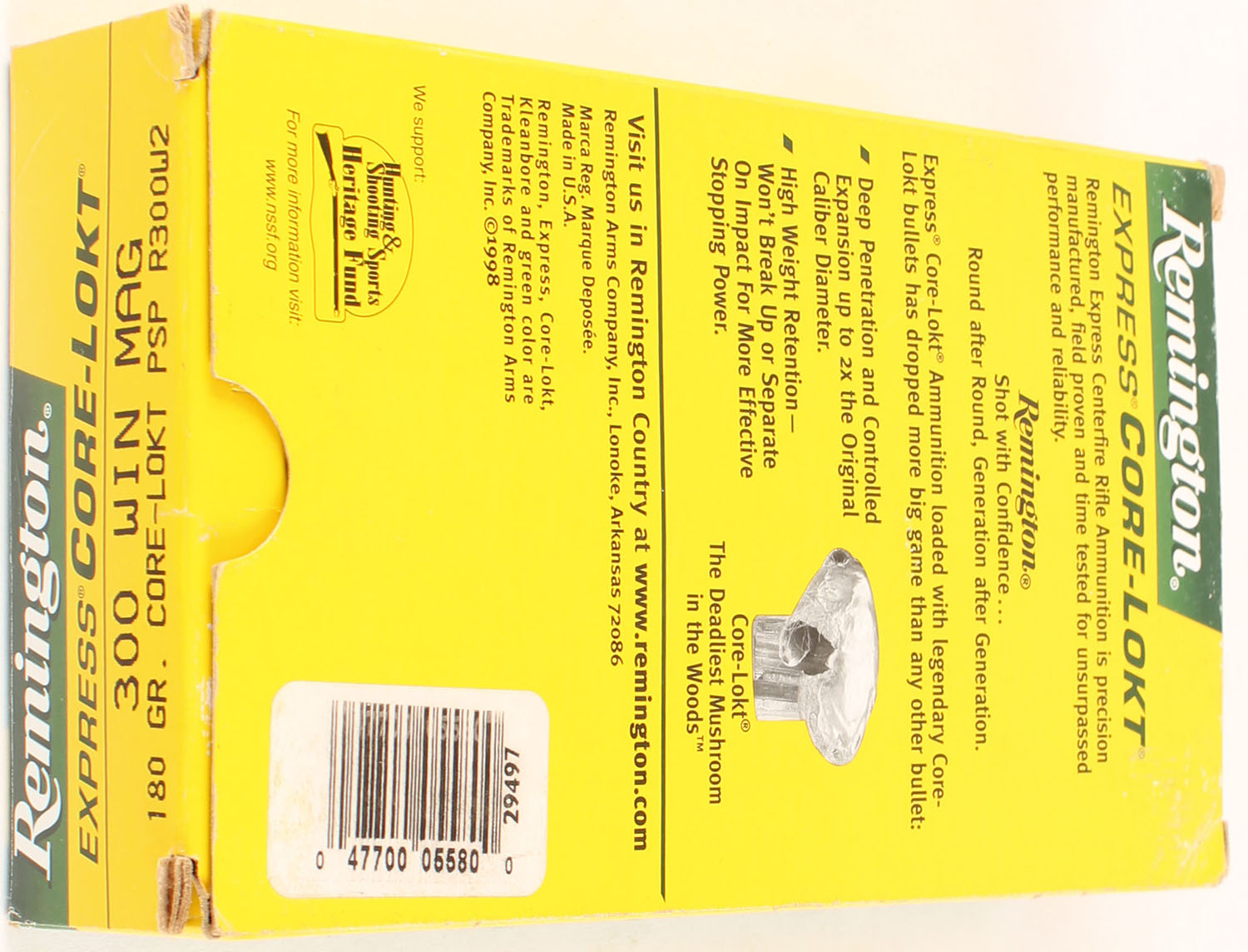 Remington, Express Core-Lokt, 300 Win Mag, 180 Grain Core-Lokt Pointed Soft Point, Full, 1pc. Yellow green & white box, box is solid with great color, end flaps are solid, ammo is excellent. Grade: Excellent + - Value: 24 to 36