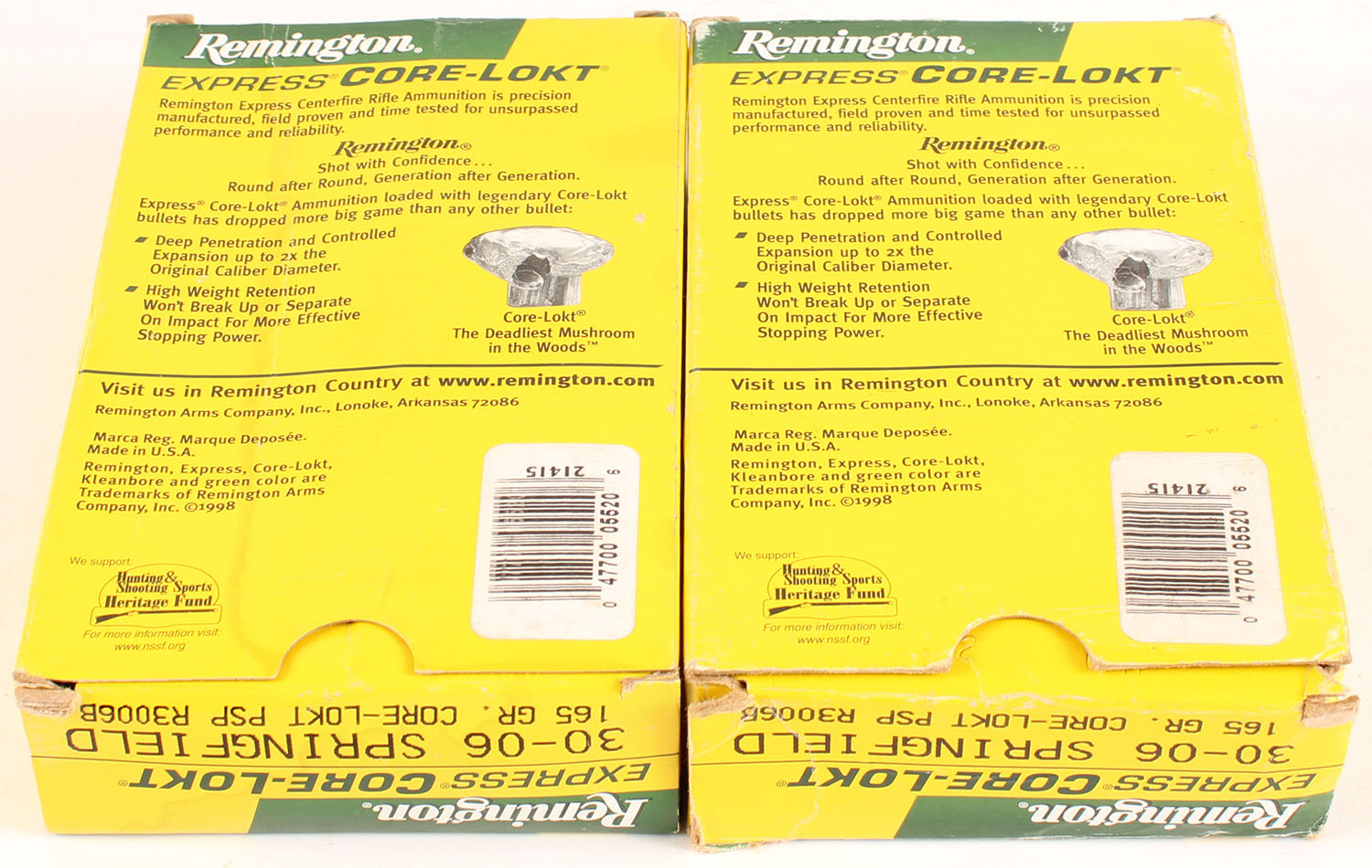Remington, Lot of (2), Express Core-Lokt, 30-06 Springfield, 165 Grain Core-Lokt Pointed Soft Point, 1pc, Full, 1pc, Yellow, green, white & black box, boxes are solid with some edge wear & light scuffing, end flaps are solid, ammo is excellent. Grade: Excellent - Value: 24 to 36