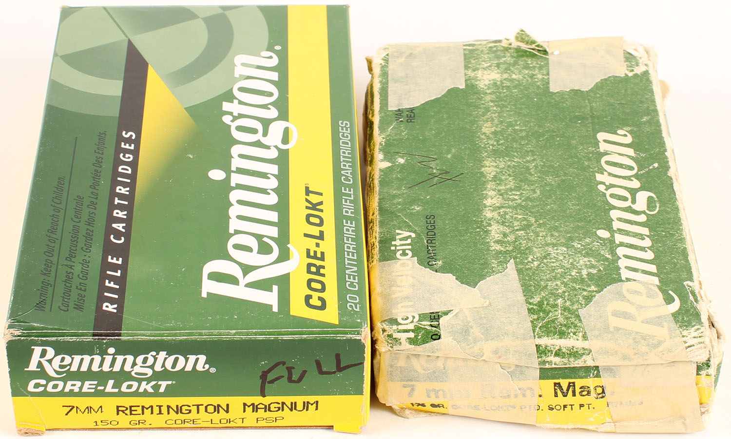 Remington, Lot of (2), 7mm REM. MAG., 150 & 175 Grain Core-Lokt PSP, 150 Gr. box is full, 175 Gr. Box is Partial 17rds. of mixed ammo, 1pc., Multi-colored boxes, (1) box is very solid, other box has tape repairs with edge wear & soiling, ammo is very good. Grade: Very Good - Value: 30 to 45