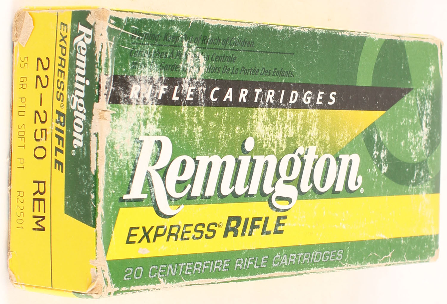 Remington, Express Rifle, 22-250 REM, 55 Gr. Pointed Soft Point, Full, 1pc., Multi-colored box, box has edge wear with rub marks, end flaps are solid, ammo is very good. Grade: Good ++ - Value: 24 to 36