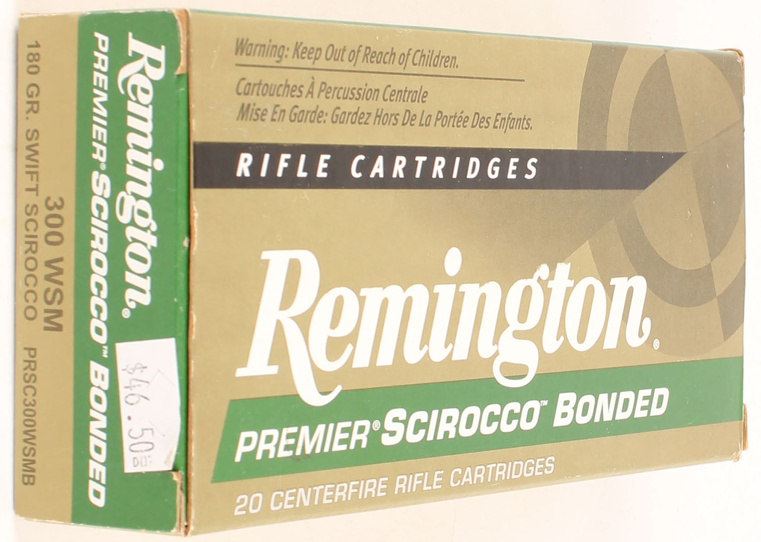Remington, Premier Scirocco Bonded, 300 WSM, 180 Grain Swift Scirocco, Full, 1pc. Gold, green, white & black box, box is solid with great color, end flaps are solid, ammo is minty. Grade: Excellent ++ - Value: 36 to 54