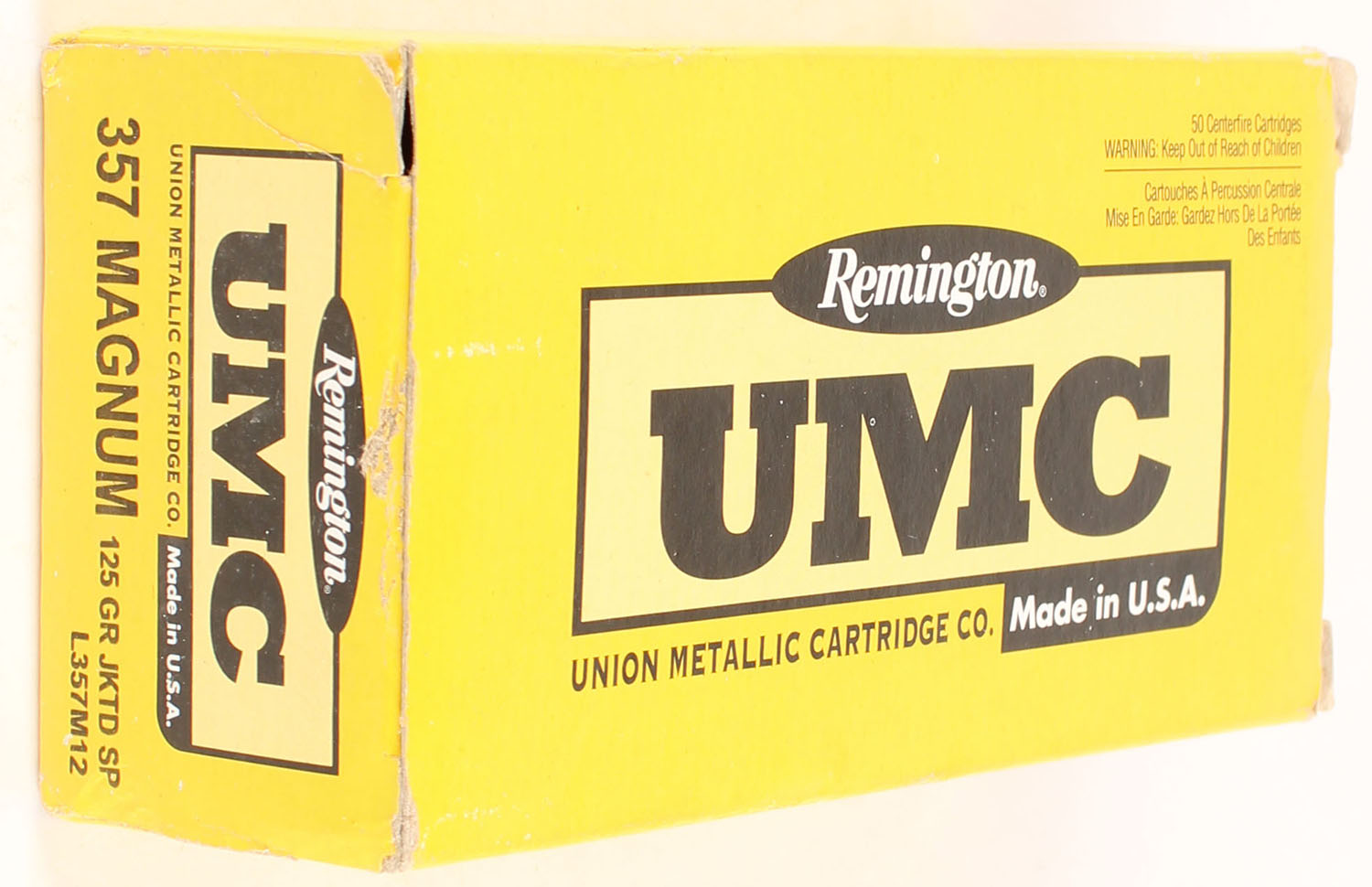 Remington, UMC, .357 Magnum, 125 Grain Jacketed Soft Point, Full, 1pc., Yellow & black box, box is solid with some edge wear, end flaps are solid, ammo is excellent. Grade: Very Good + - Value: 24 to 36