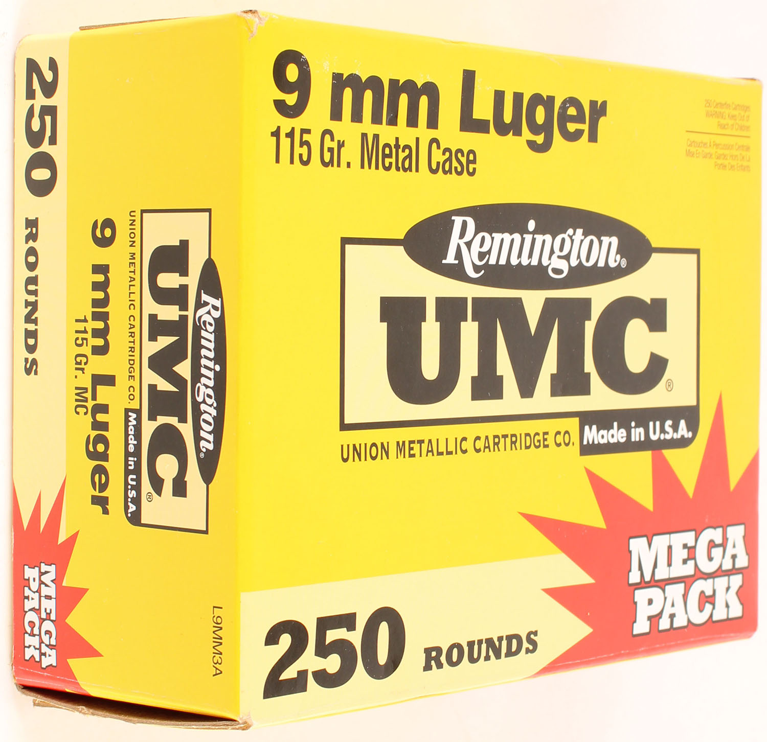 Remington, UMC, 9mm Luger, 115 Grain Metal Case, Full 250rds., 1pc., case is very solid with excellent colors, ammo is excellent. Grade: Excellent ++ - Value: 60 to 90