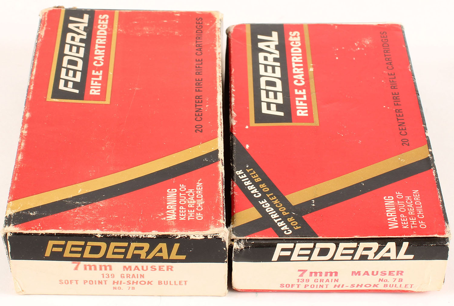 Federal, Lot of (2), 7mm Mauser, 139 Grain Soft Point Hi-Shok Bullet, Full, 1pc., Multi-colored boxes, boxes have age soiling with edge wear, ammo is good. Grade: Very Good - Value: 24 to 36