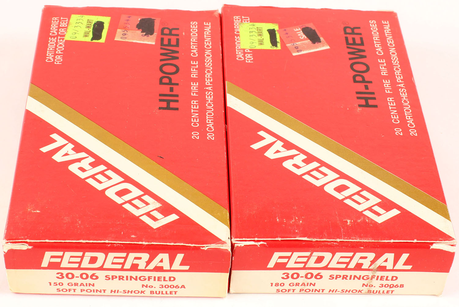Federal, Lot of (2) Hi-Power, 30-06 Springfield, 150 & 180 Grain Soft Point Hi-Shok, Full, 1pc., Red, white & black boxes, boxes are solid with very good color, light corner wear, end flaps are solid, ammo is excellent. Grade: Very Good ++ - Value: 24 to 36