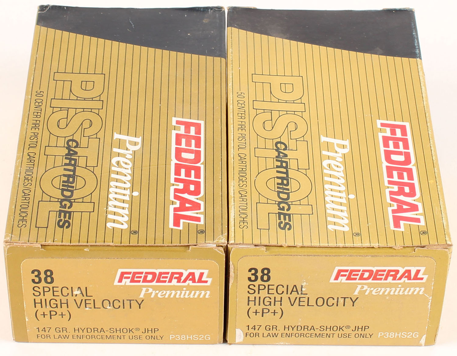 Federal, Lot of (2), Premium, .38 Special High Velocity (!W%W!), 147 Grain Hydra-Shok Jacketed Hollow Point, Full, 1pc., multi-colored boxes, boxes are very solid, end flaps are solid, ammo is excellent. Grade: Excellent + - Value: 40 to 60