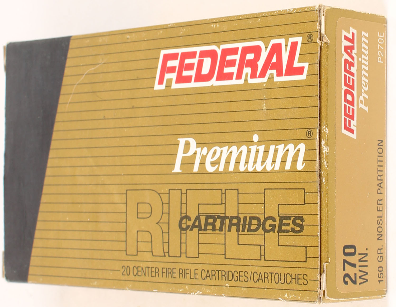 Federal, Premium, 270 Winchester, 150 Grain Nosler Partition, Full, 1pc., multi-colored box, box is solid with great color, end flaps are solid, ammo is excellent. Grade: Excellent + - Value: 30 to 45
