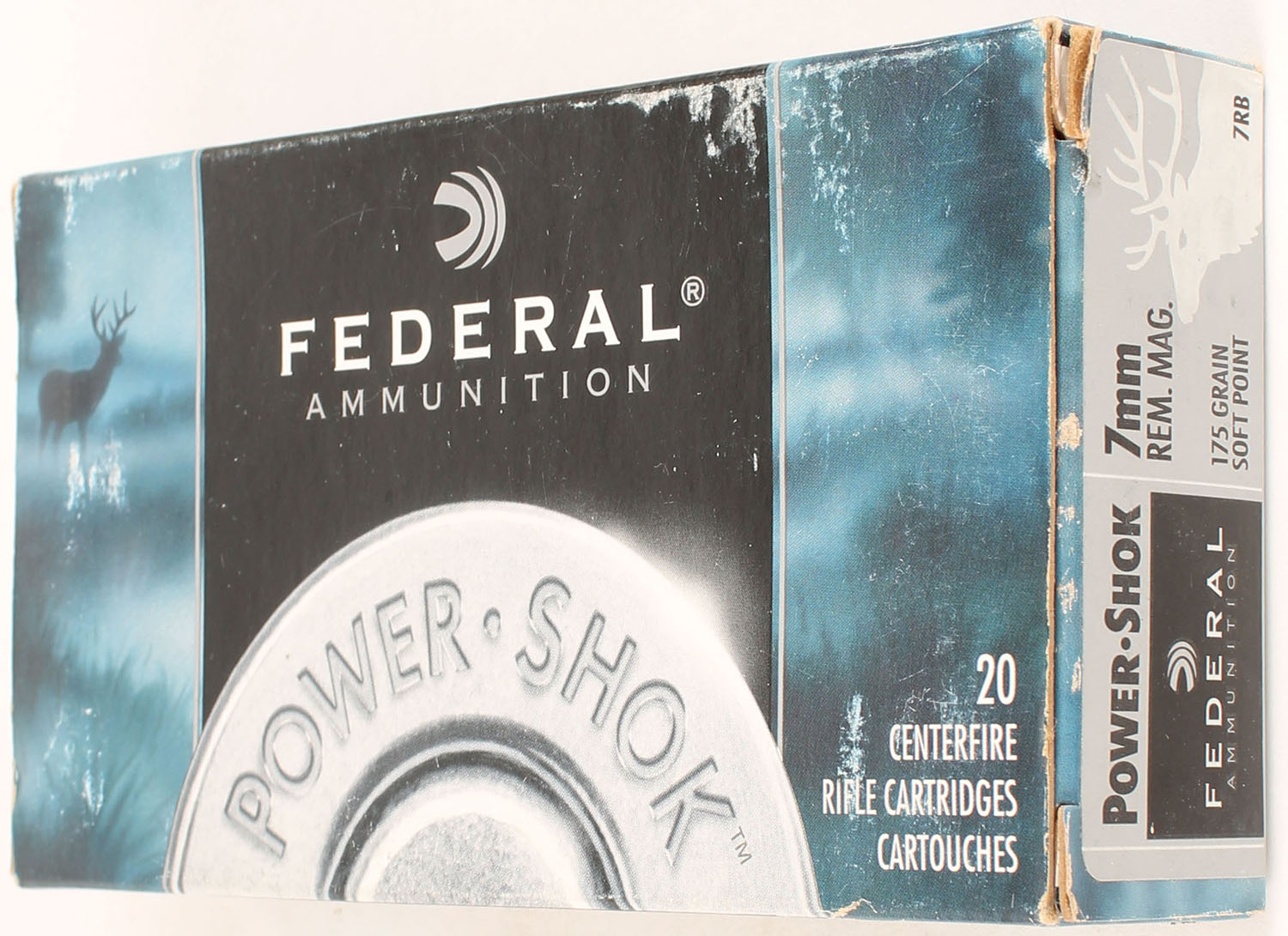 Federal, Power Shok, 7mm Rem. Mag. 175 Grain Soft Point, Full, 1pc., multi-colored box, box has edge wear, ammo is excellent. Grade: Very Good - Value: 16 to 24
