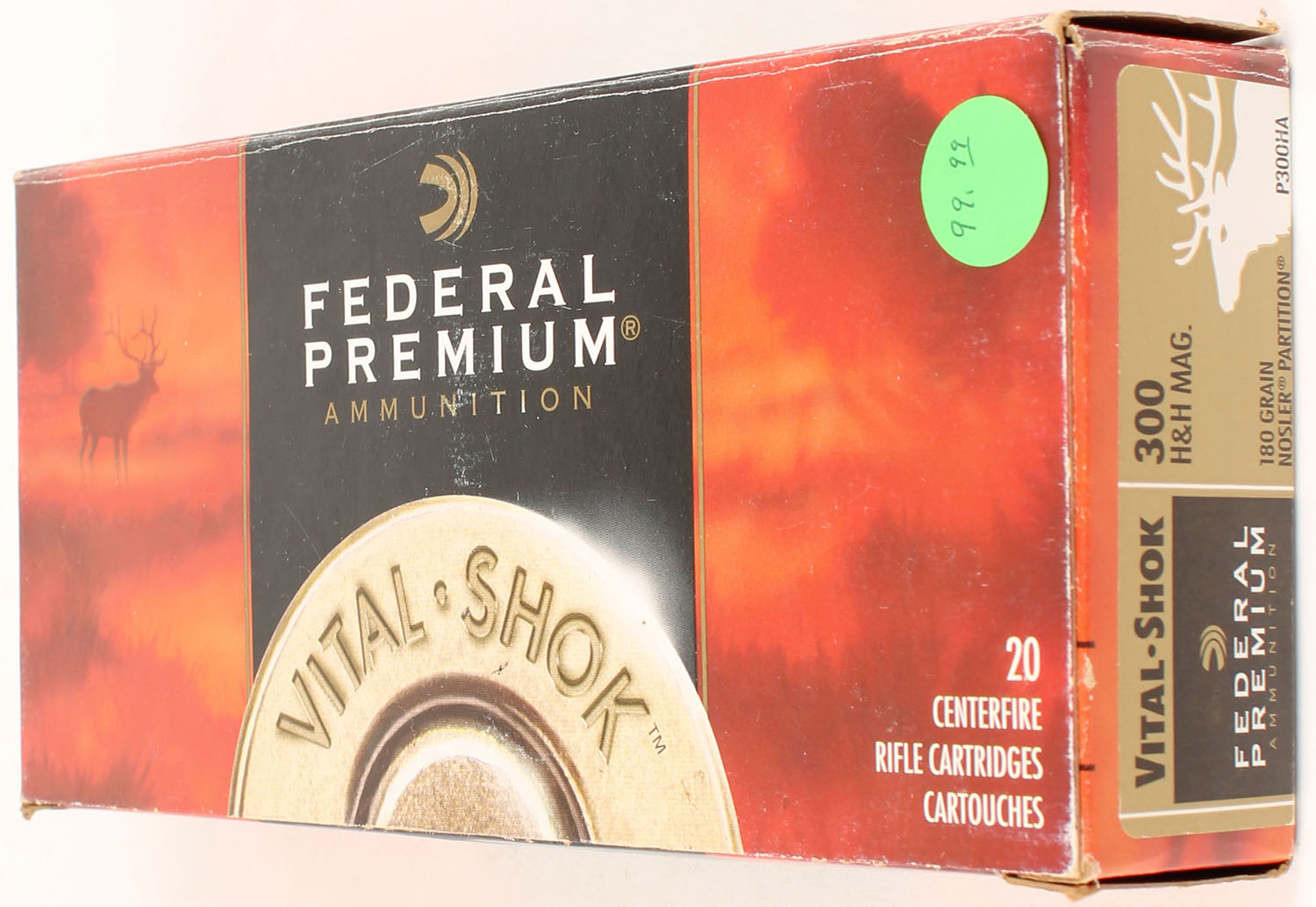 Federal, Vital-Shok, 300 H&H Mag, 180 Grain Nosler Partition, Full, 1pc. Multi-colored box, box is solid with great color, end flaps are solid, ammo is excellent. Grade: Excellent ++ - Value: 50 to 75