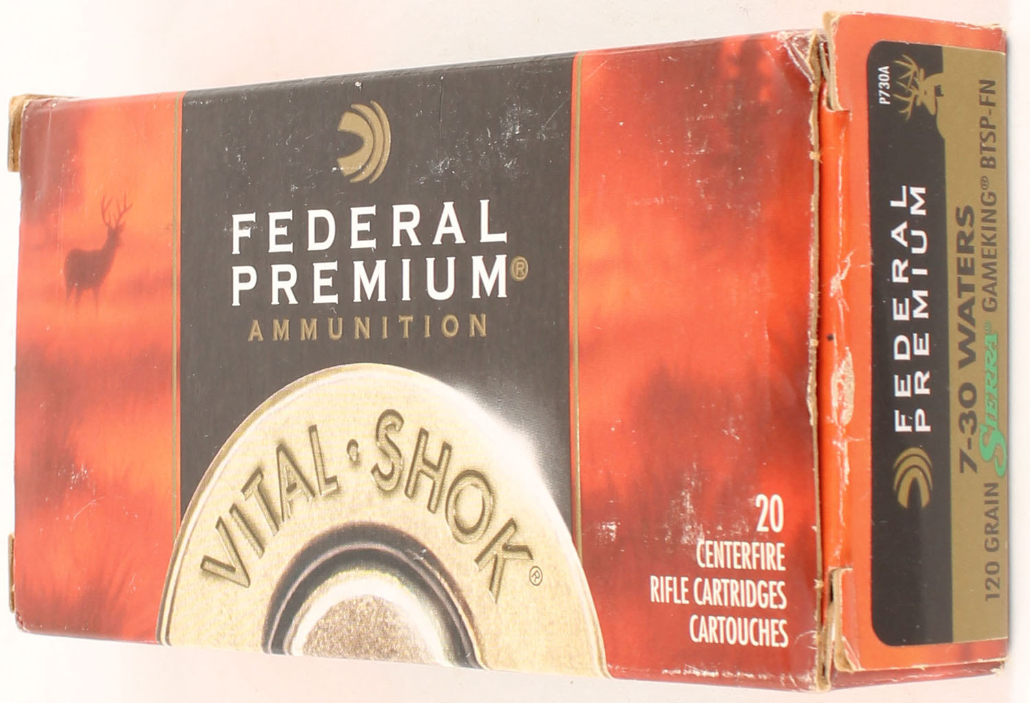 Federal, Vital-Shok, 7-30 Waters, 120 Grain Sierra Gameking Boat Tail Soft Point - Flat Nose, Full, 1pc., multi-colored box, box is solid with light scuffing, ammo is minty. Grade: Excellent + - Value: 48 to 72