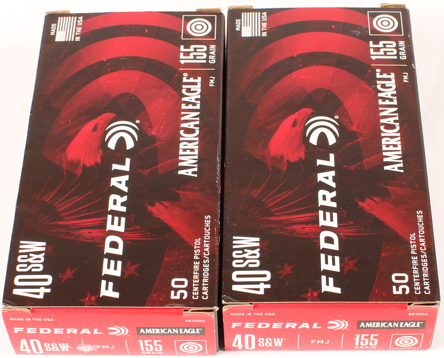 Federal, Lot of (2), American Eagle, 40 Smith & Wesson, 155 Grain FMJ, Full, 1pc., multi-colored boxes, boxes are solid with great color, end flaps are solid, ammo is excellent. Grade: Excellent ++ - Value: 30 to 45
