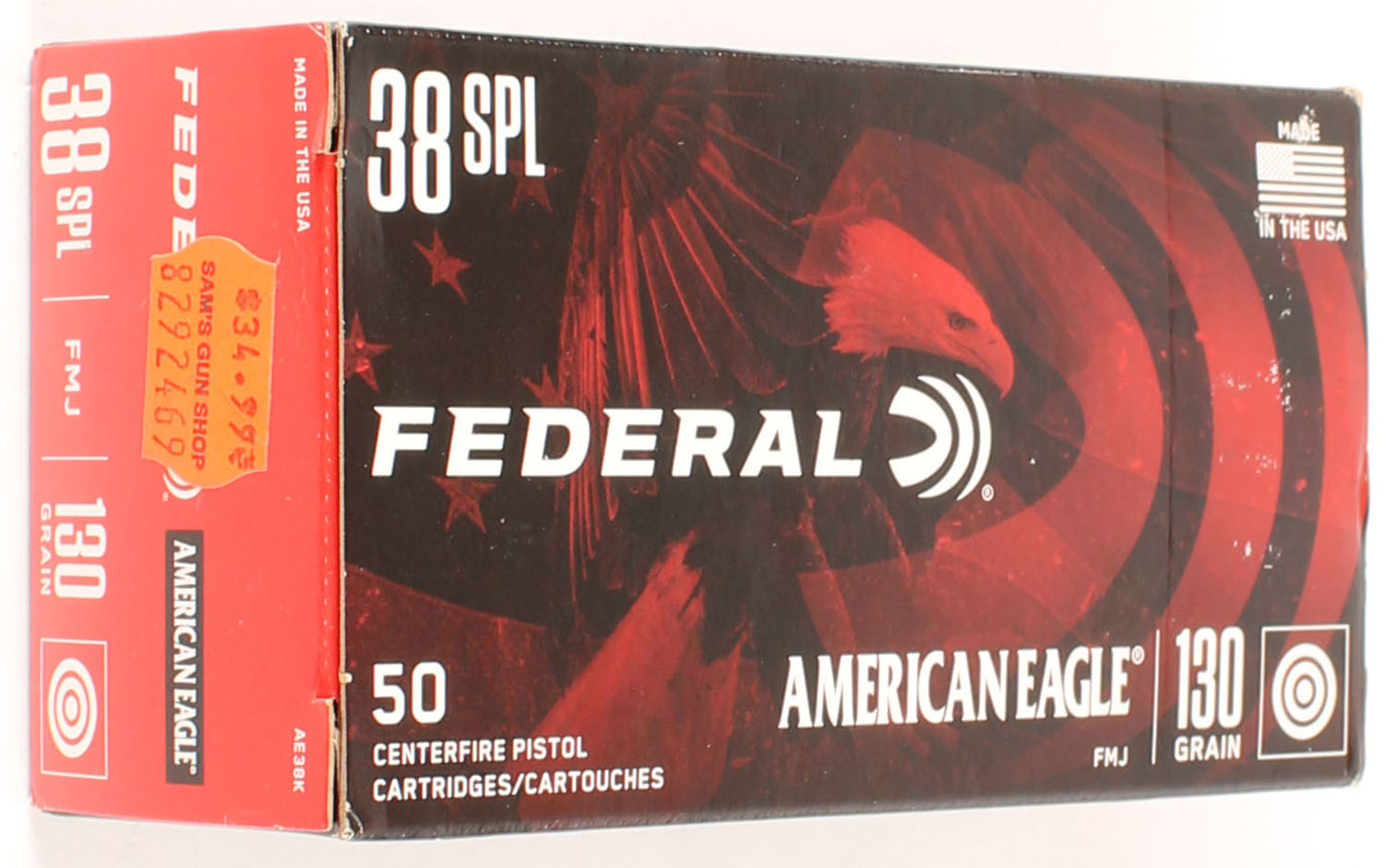 Federal, American Eagle, 38 Special, 130 Grain FMJ, Full, 1pc. Multi-colored box, box is solid with great color, end flaps are solid, ammo is excellent. Grade: MINT - Value: 16 to 24