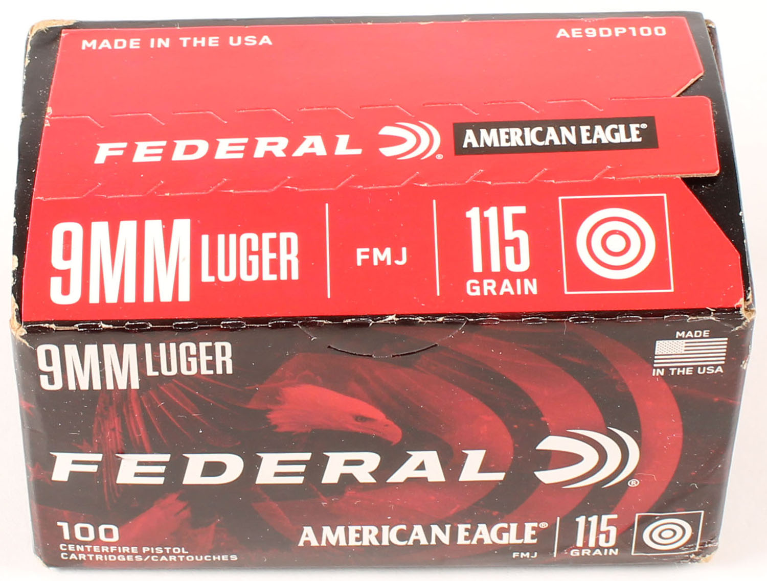 Federal , American Eagle, 9mm Luger, 115 Grain FMJ, FULL & SEALED, 1pc. Multi-colored box, box is solid with great color, light edge & corner wear, minor shelf wear, end flaps are solid. Grade: Excellent ++ - Value: 40 to 60