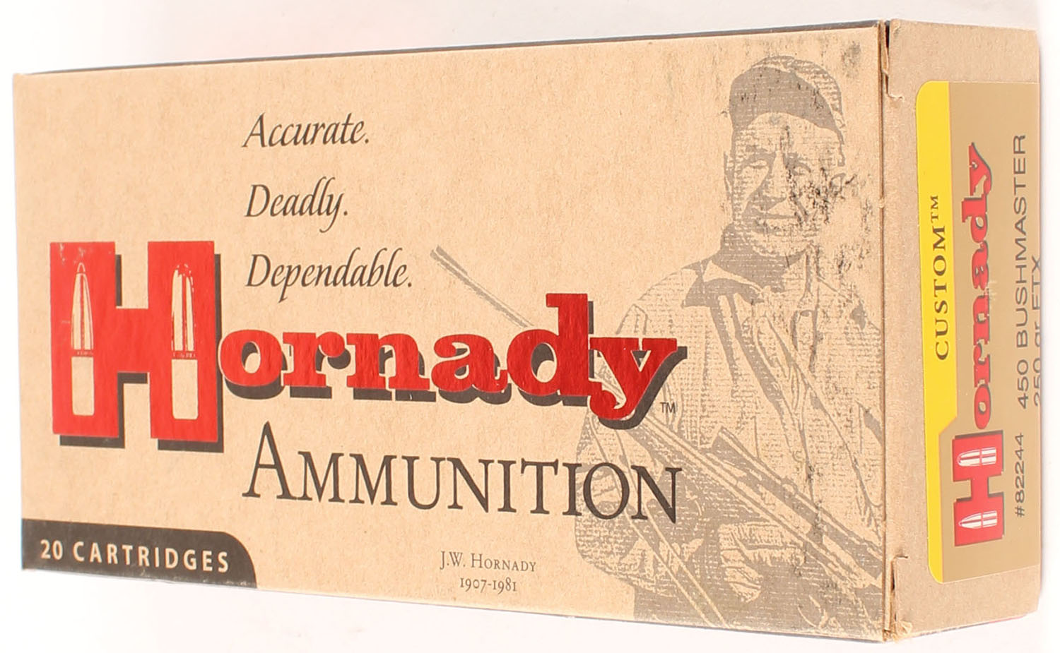 Hornady, Custom, 450 Bushmaster, 250 Grain FTX, Full, 1pc. multi-colored box, box is solid with excellent color, Ammo is excellent. Grade: Excellent ++ - Value: 30 to 45