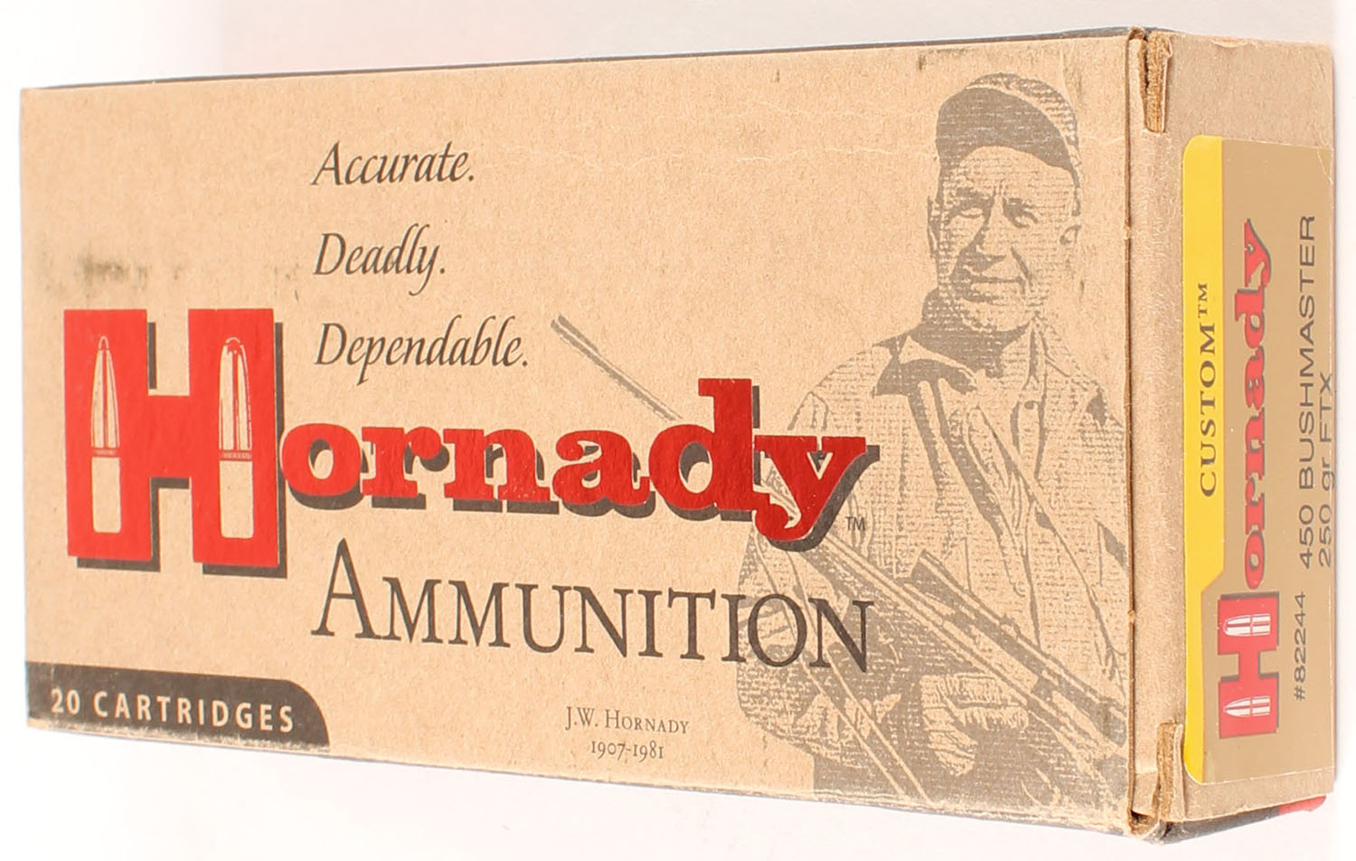 Hornady, Custom, 450 Bushmaster, 250 Grain FTX, Full, 1pc. multi-colored box, box is solid with excellent color, Ammo is excellent. Grade: Excellent ++ - Value: 30 to 45