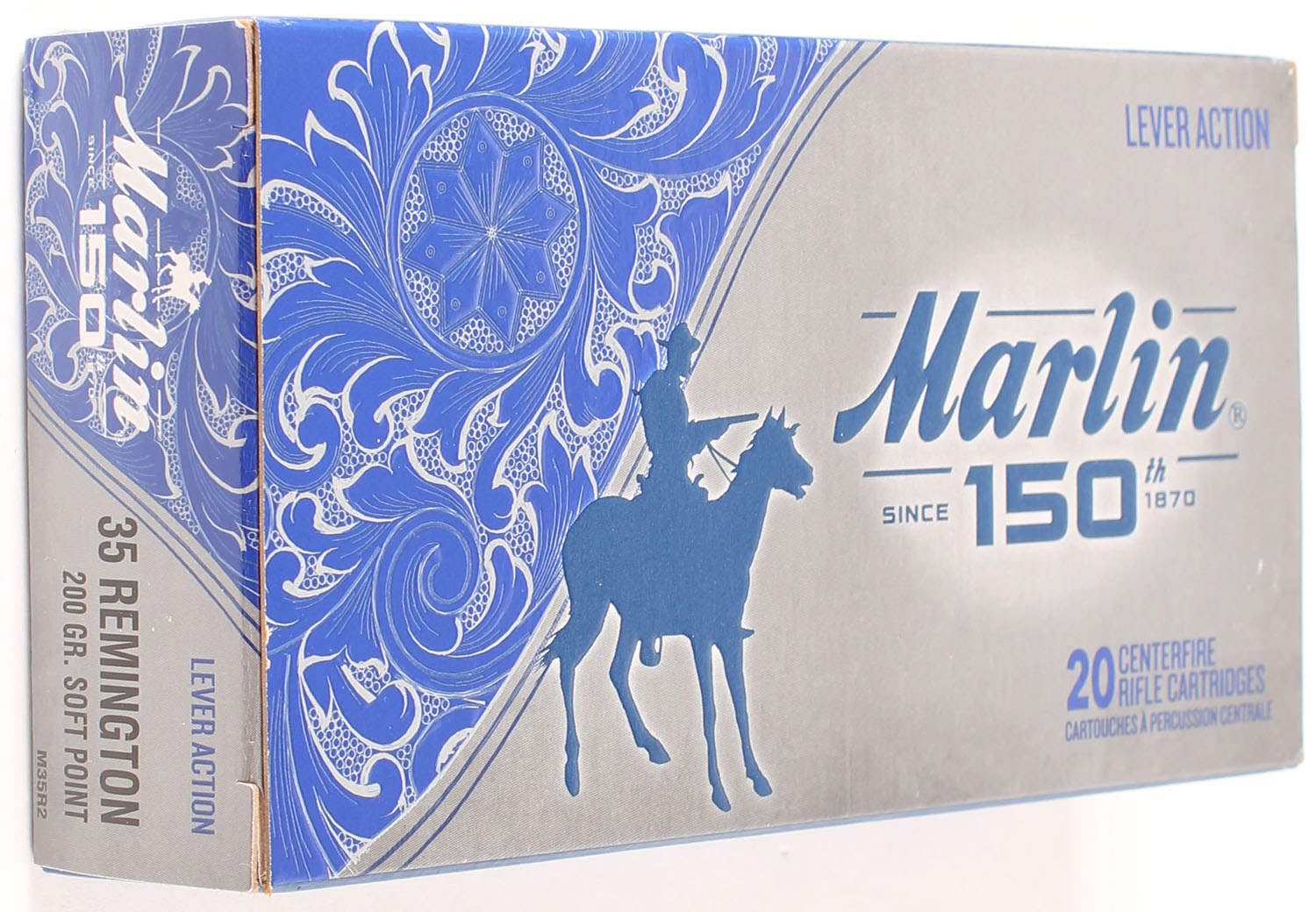 Marlin 150th Anniversary, Lever Action, 35 Remington, 200 Gr. Soft Point, Full, 1pc. multi-colored box, box is solid with excellent color, Ammo is excellent. Grade: Excellent ++ - Value: 50 to 75