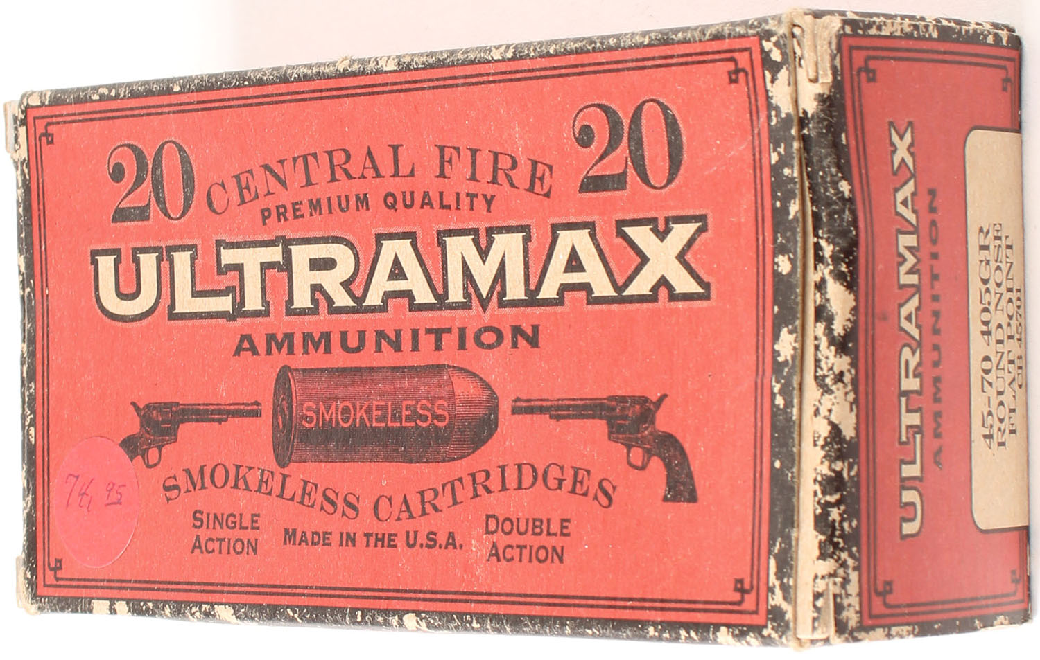 Ultramax, .45-70, 405 Grain RN Flat Point, Partial 18rds, Black & red box with black & white print, box is solid with good color, has minor corner wear, ammo is very good. Grade: Excellent - Value: 20 to 30