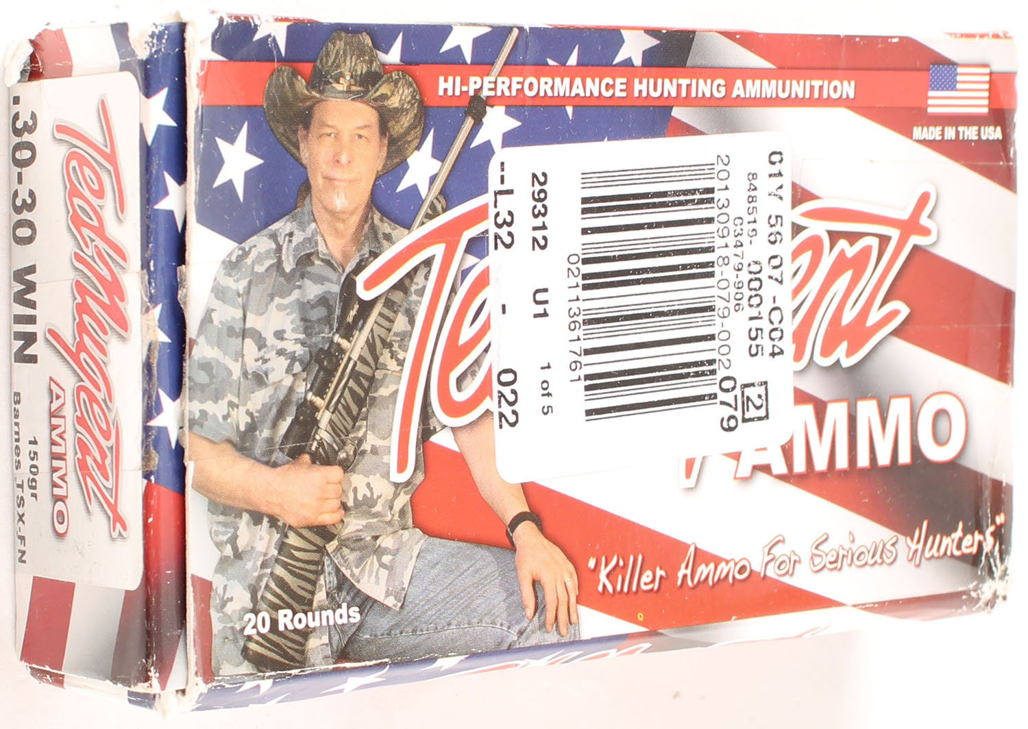 Ted Nugent, .30-30 Winchester, 150 Grain Barnes TSX-FN, Full, 1pc, Multi-colored box, box has scuffing & edge wear, ammo is minty with 'NUGENT' H/S. Grade: Very Good ++ - Value: 30 to 45