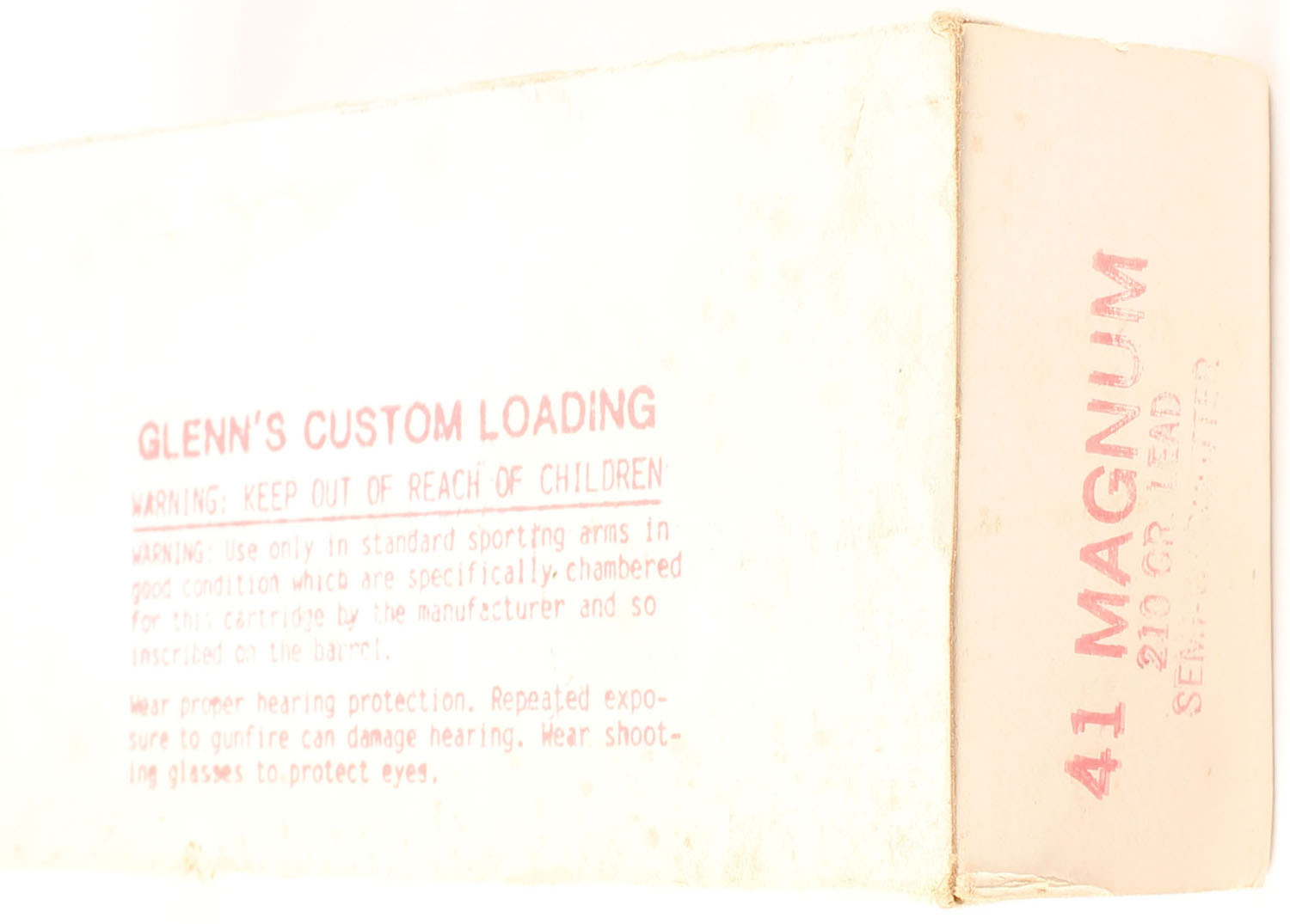 Glenn's Custom Loading, 41 Magnum, 210 Grain Lead Semi-Wadcutter, Full, 1pc, white box with red print, box has light scuffing, ammo is excellent. Grade: Very Good - Value: 16 to 24