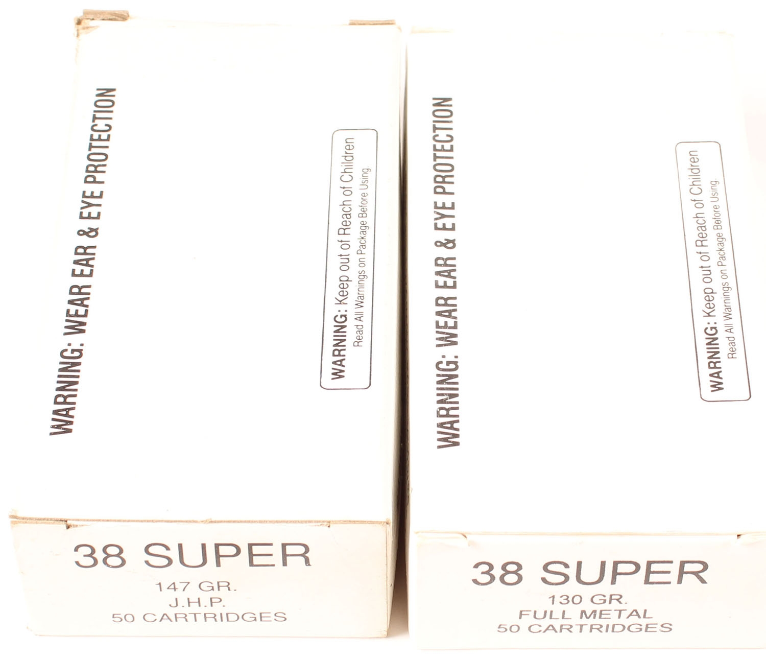 Unknown Mfg., Lot of (2), .38 Super, 130 Grain Full Metal & 147 Grain JHP, Full, 1pc, white boxes are solid, ammo is excellent. Grade: Very Good ++ - Value: 24 to 36