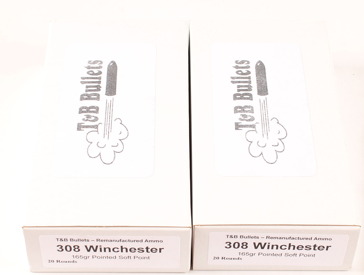 T&B Bullets, Lot of (2), .308 Winchester, Remanufactured Ammo by a class type 7 Ammo MFG (this is the same class (high quality) as Winchester, Federal and or CCI), 165 Grain Soft Point bullet, loaded cartridges, Full, 1pc, white box is very solid, ammo is excellent. Grade: Excellent ++ - Value: 20 to 30
