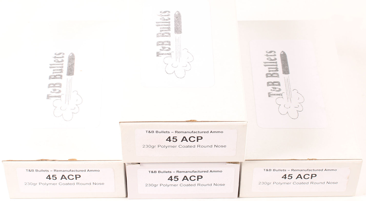 T&B Bullets, Lot of (4), .45 ACP, Remanufactured Ammo by a class type 7 Ammo MFG (this is the same class (high quality) as Winchester, Federal and or CCI), 230 Grain Polymer Coated Round Nose bullet, loaded cartridges, 1pc, Full 50 count boxes, white boxes are very solid, ammo is minty. Grade: Excellent ++` - Value: 30 to 45