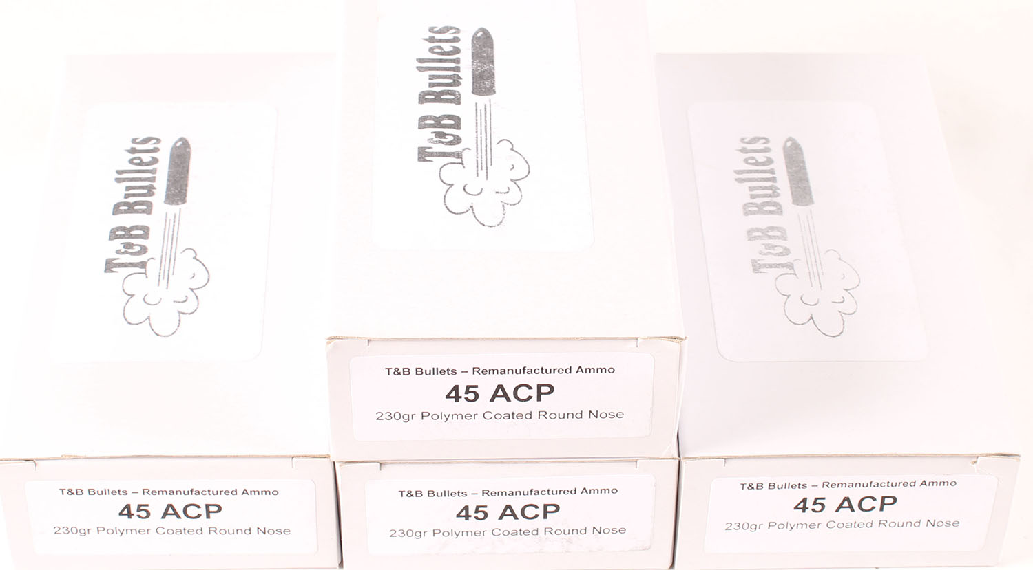 T&B Bullets, Lot of (4), .45 ACP, Remanufactured Ammo by a class type 7 Ammo MFG (this is the same class (high quality) as Winchester, Federal and or CCI), 230 Grain Polymer Coated Round Nose bullet, loaded cartridges, 1pc, Full 50 count boxes, white boxes are very solid, ammo is minty. Grade: Excellent ++` - Value: 30 to 45
