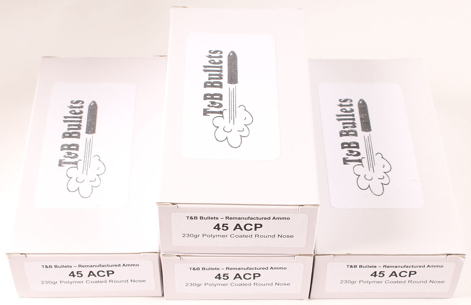 T&B Bullets, Lot of (4), .45 ACP, Remanufactured Ammo by a class type 7 Ammo MFG (this is the same class (high quality) as Winchester, Federal and or CCI), 230 Grain Polymer Coated Round Nose bullet, loaded cartridges, 1pc, Full 50 count boxes, white boxes are very solid, ammo is minty. Grade: Excellent ++` - Value: 30 to 45