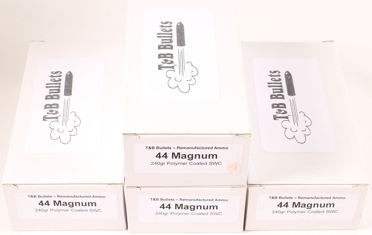T&B Bullets, Lot of (4), .44 Magnum, Remanufactured Ammo by a class type 7 Ammo MFG (this is the same class (high quality) as Winchester, Federal and or CCI), , 240 Grain Polymer Coated SWC bullet, loaded cartridges, 1pc, Full 50 count boxes, white boxes are very solid, ammo is minty. Grade: Excellent ++ - Value: 80 to 120