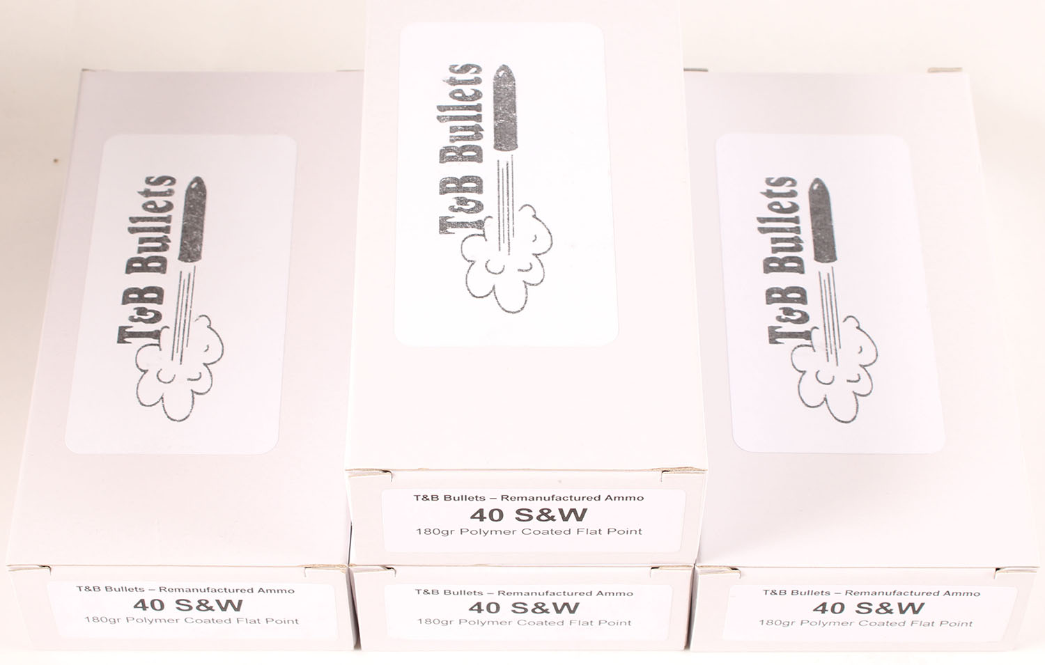 T&B Bullets, Lot of (4), .40 Smith & Wesson, Remanufactured Ammo by a class type 7 Ammo MFG (this is the same class (high quality) as Winchester, Federal and or CCI), 180 Grain Polymer Coated Flat Point bullet, loaded cartridges, 1pc, Full 50 count boxes, white boxes are very solid, ammo is minty. Grade: Excellent ++ - Value: 30 to 45