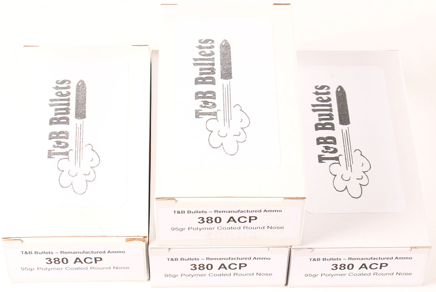 T&B Bullets, Lot of (4), .380 ACP, Remanufactured Ammo by a class type 7 Ammo MFG (this is the same class (high quality) as Winchester, Federal and or CCI), 95 Grain Polymer Coated Round Nose bullet, loaded cartridges, 1pc, Full 50 count boxes, white boxes are very solid, ammo is minty. Grade: Excellent ++ - Value: 30 to 45