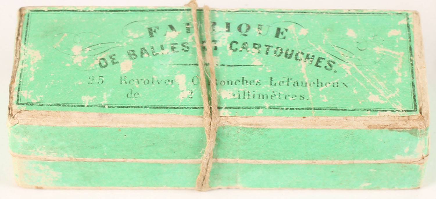 Charles Fusnot, Brussels, 12mm Pinfire, For Lefaucheux pinfire revolvers, Appears Full, 2pc, box is green with black print, box has scuffing with light age soiling. Grade: Very Good ++ - Value: 100 to 150