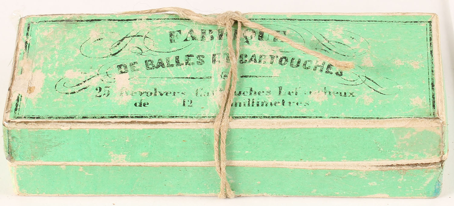 Charles Fusnot, Brussels, 12mm Pinfire, For Lefaucheux pinfire revolvers, Appears Full, 2pc, box is green with black print, box has scuffing with light age soiling. Grade: Very Good ++ - Value: 100 to 150