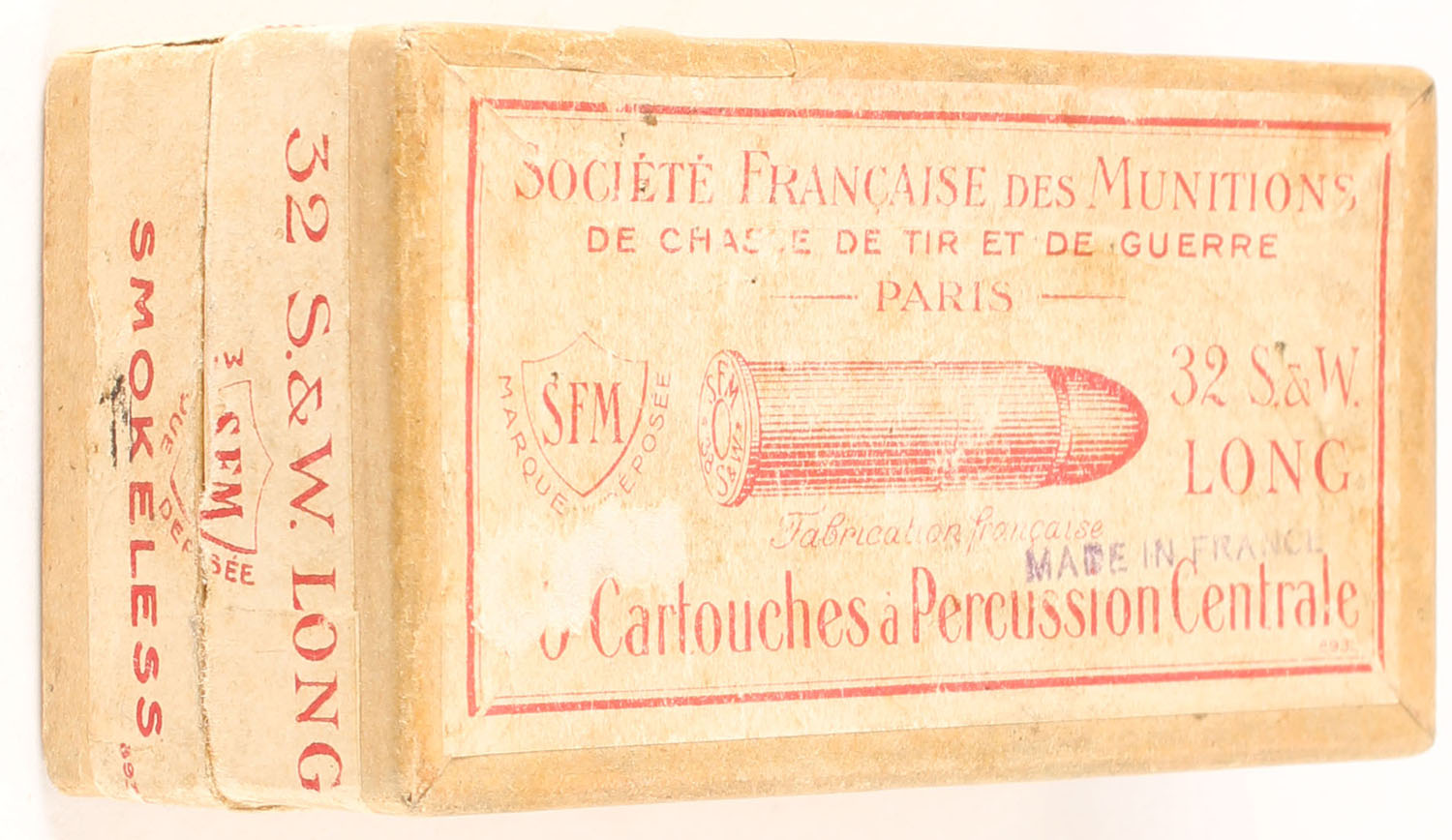 Societe Francaise Des Munitions, .32 Smith & Wesson Long, Smokeless, Full, 2pc, Buff box with buff & red label, box has light age soiling with some edge wear, ammo is very good. Grade: Very Good + - Value: 60 to 90