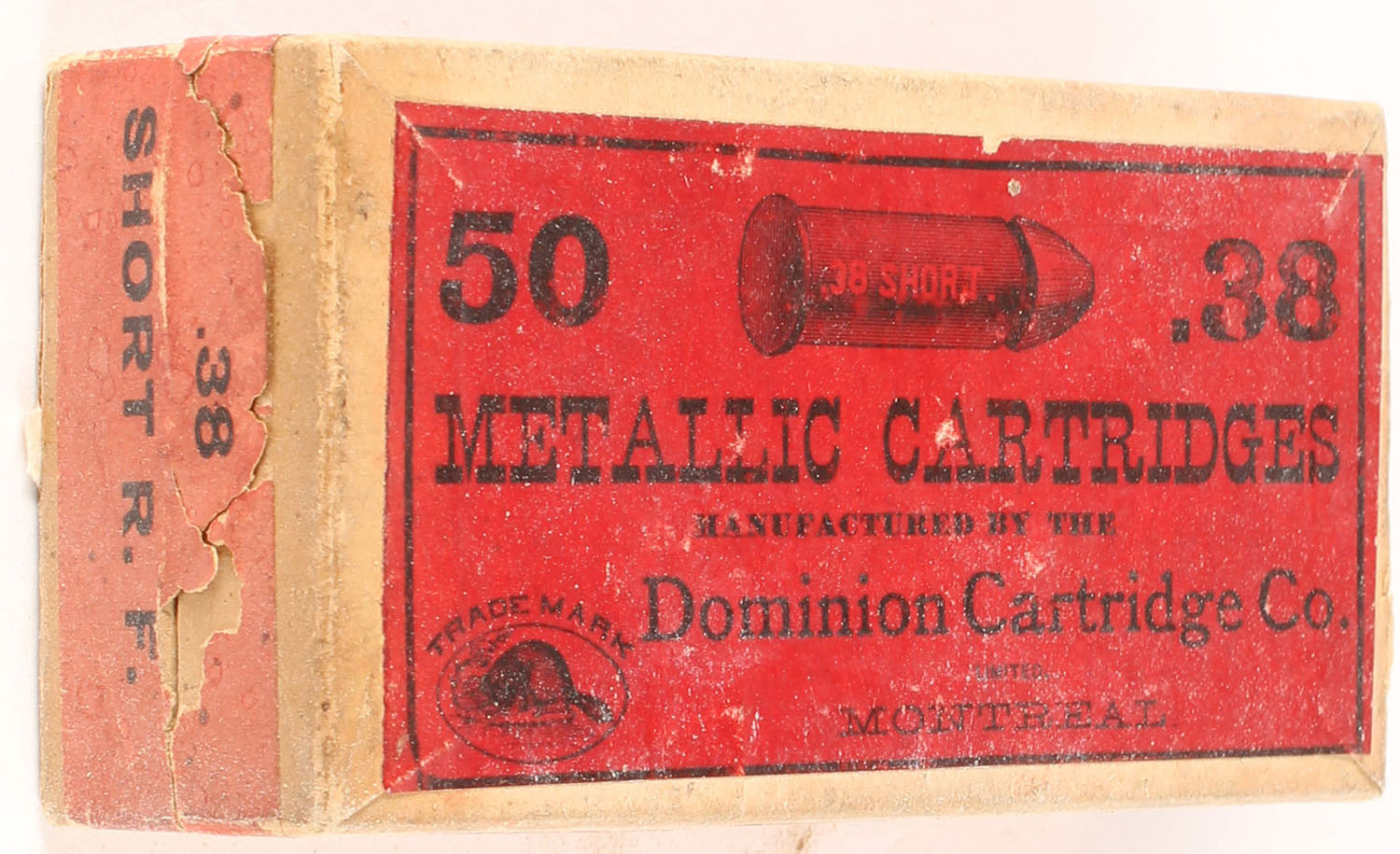 Dominion Cartridge Co., .38 Short R.F., 2pc, FULL & SEALED, buff box with red label & white/red print, box is solid with light rub marks, box has seam splits to bottom. Grade: Excellent + - Value: 200 to 300
