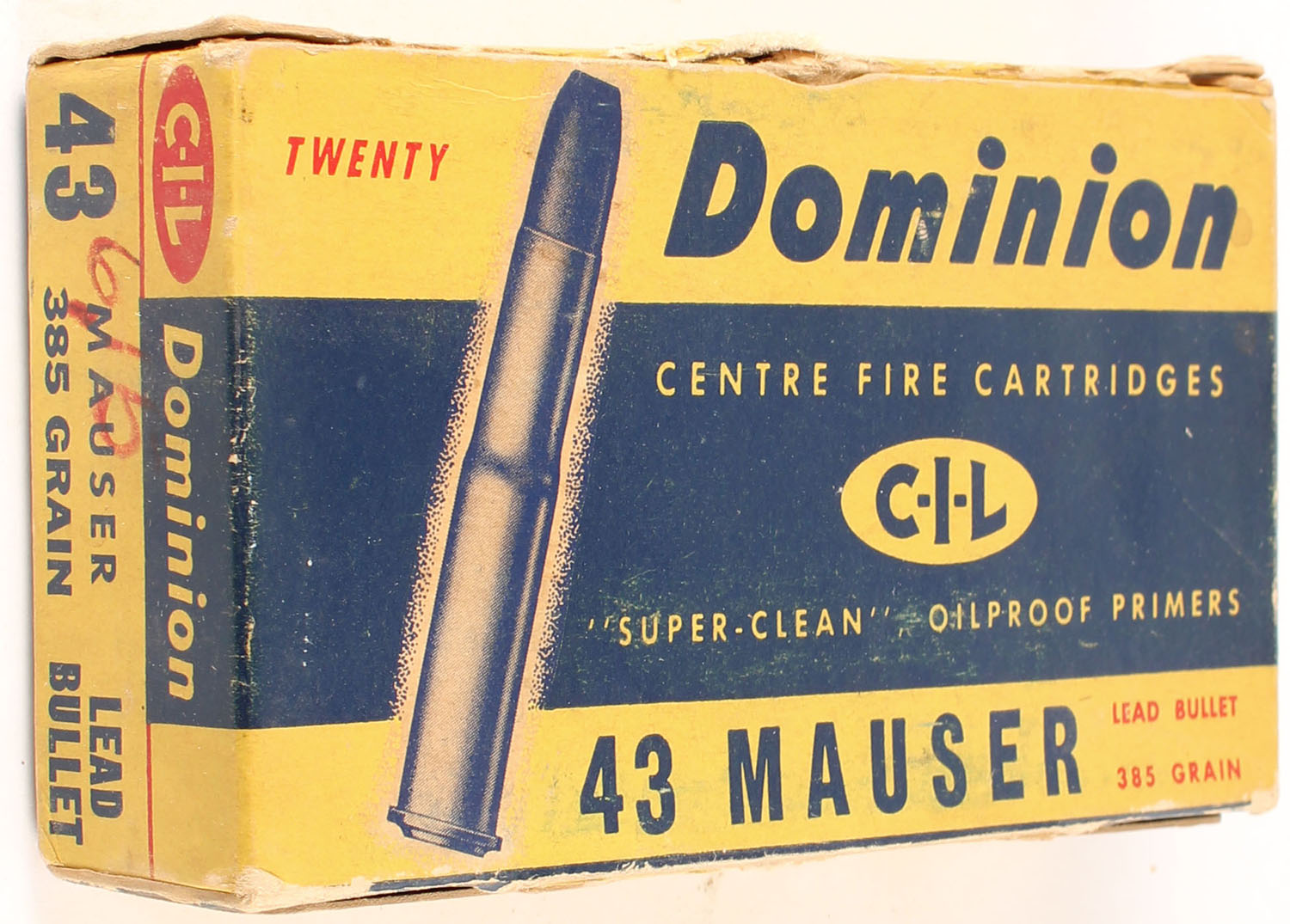 Dominion, .43 Mauser, 385 Lead Bullet, 1pc, Partial 9 Rds., multi-colored box, box is solid with light scuffing & edge wear, ammo is very good. Grade: Very Good ++ - Value: 20 to 30