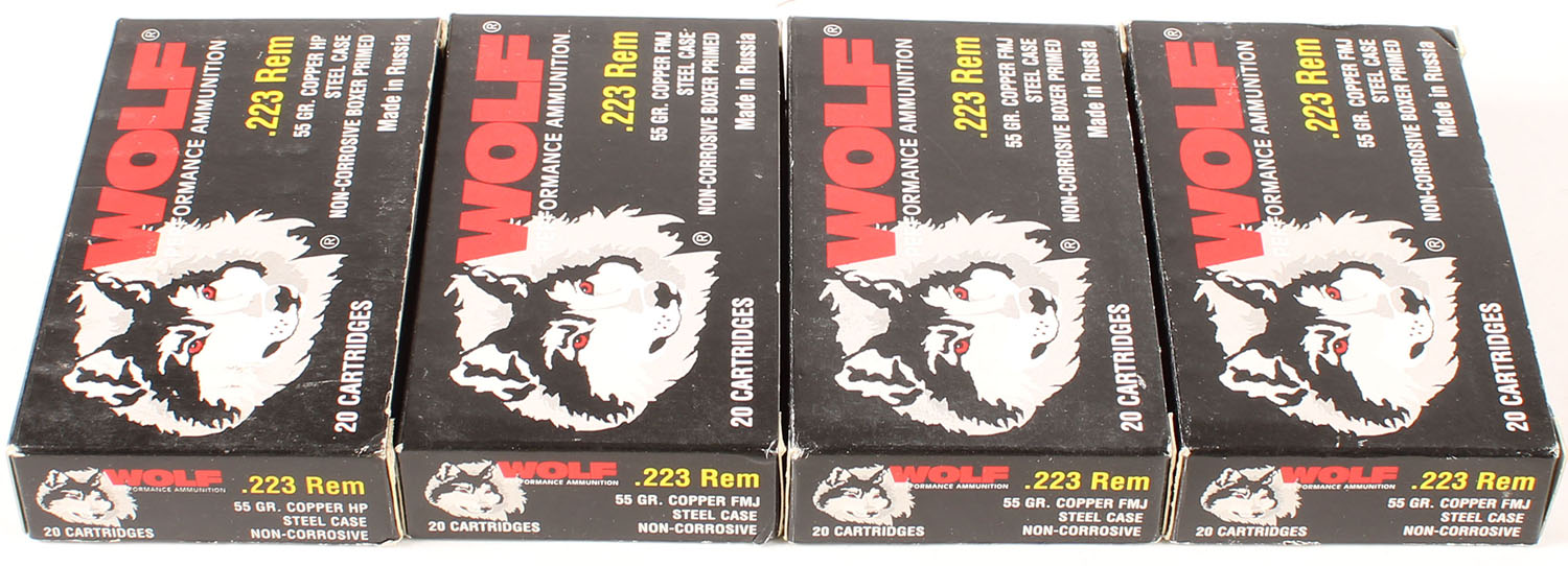 Wolf, Lot of (4), .223 Rem, 55 Grain Copper FMJ, Full, 1pc., Multi-colored boxes, boxes are very solid with excellent color, Ammo is excellent. Grade: MINT - Value: 24 to 36