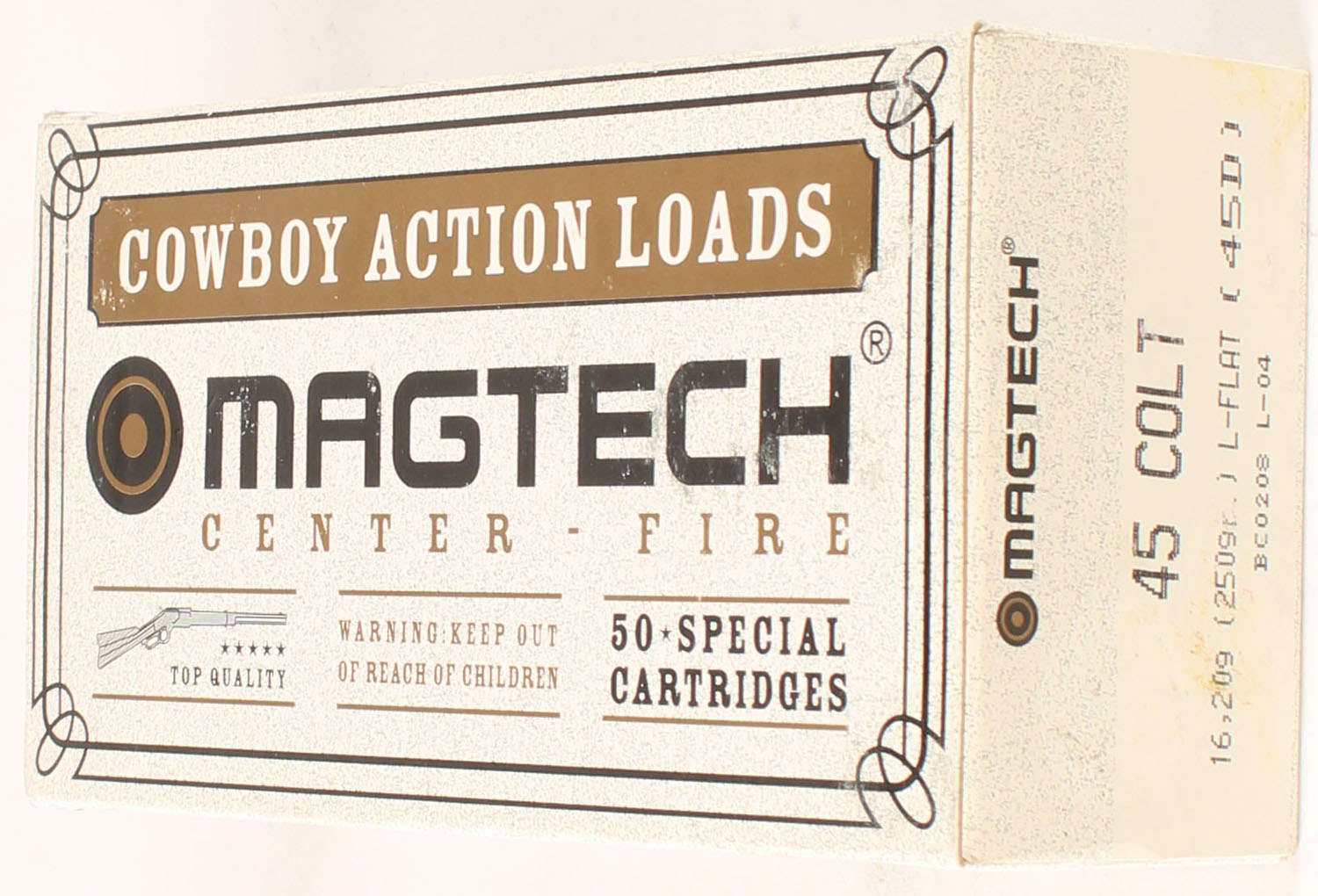 Magtech, Cowboy Action Loads, .45 Colt, 250 Grain L-Flat, Full, 1pc. White & gold box, box is very solid with excellent color, ammo is minty. Grade: MINT - Value: 30 to 45