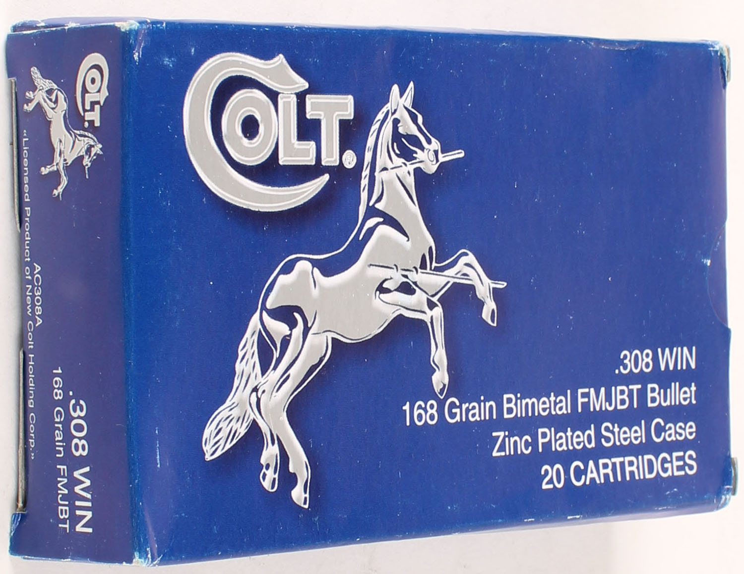 COLT, .308 Winchester, 168 Grain FMJBT, Full, 1pc. Multi-colored box, box is solid with excellent color, Ammo is excellent. Grade: Excellent - Value: 26 to 39