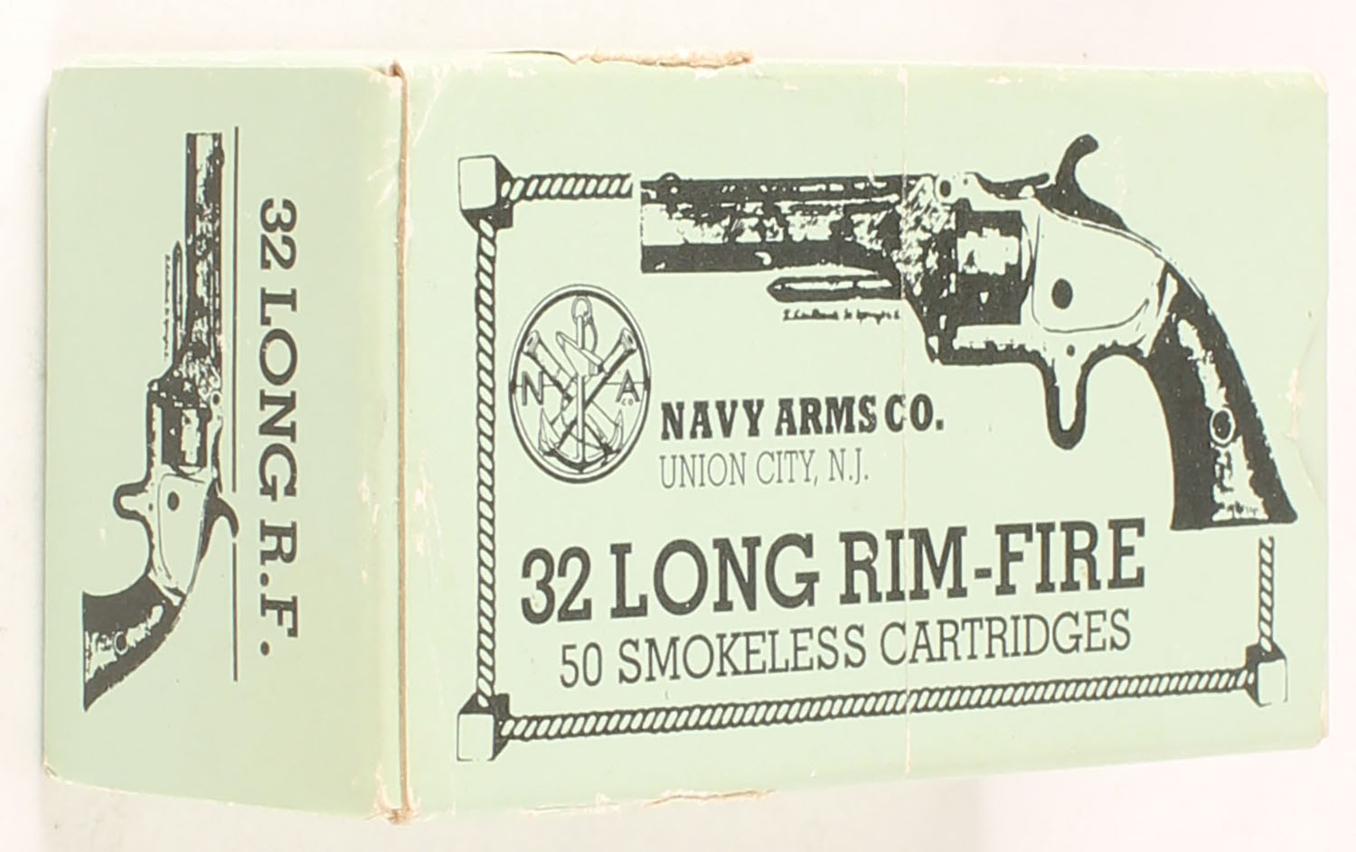 Navy Arms Co., 32 Long R.F., Partial 46rds, 1pc. Multi-colored box, box is very solid with excellent color, has minor edge wear, Ammo is excellent. Grade: Excellent + - Value: 60 to 90