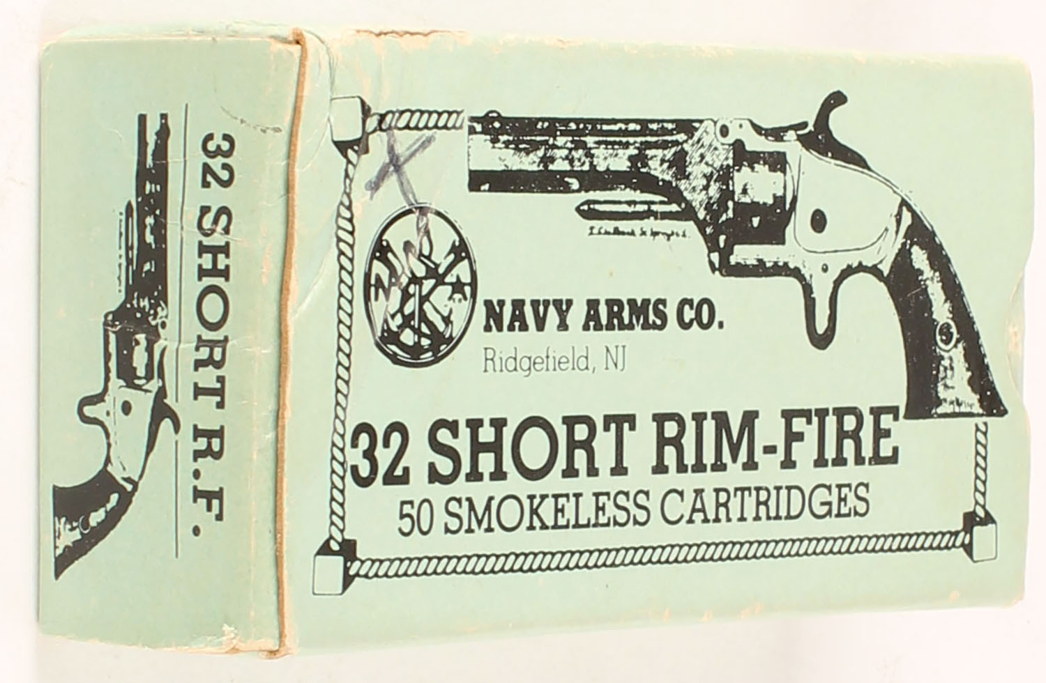 Navy Arms Co., 32 Short R.F., Partial 26rds, 1pc. Multi-colored box, box has some edge wear, Ammo is excellent. Grade: Very Good ++ - Value: 60 to 90